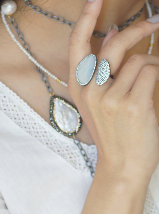 This collection is a mermaid's dream featuring all natural mother of pearls from the depths of the sea. Hand crafted using sterling silver and the finest workmanship, each piece promises to bring a taste of elegance and flair to any outfit.