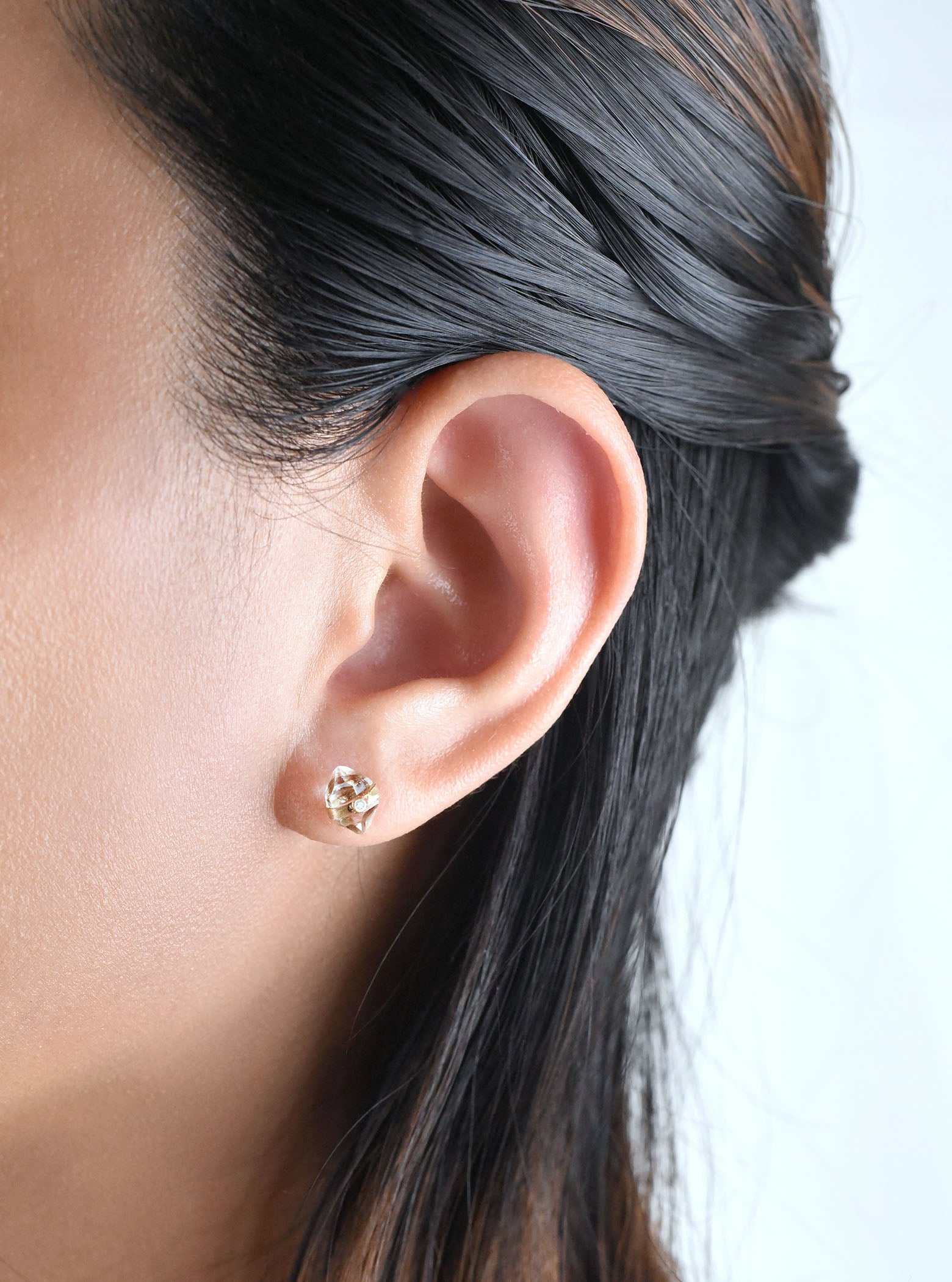 Crafted in luminous 18K yellow gold, this design highlights the raw brilliance of natural Herkimer quartz. Each crystal’s shape and clarity make every pair subtly one-of-a-kind.