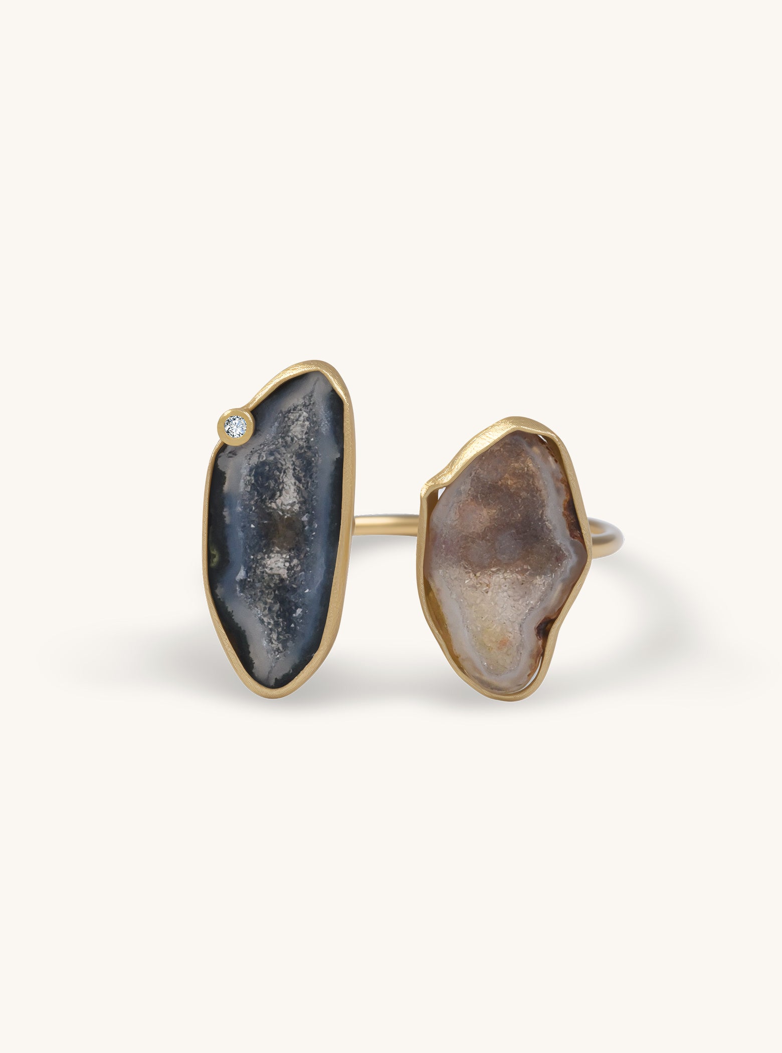 Two natural geodes sparkle with crystalline depth, framed in 18k solid gold and paired with a subtle diamond accent. Each ring is completely unique — a wearable expression of earth’s natural artistry and refined craftsmanship.