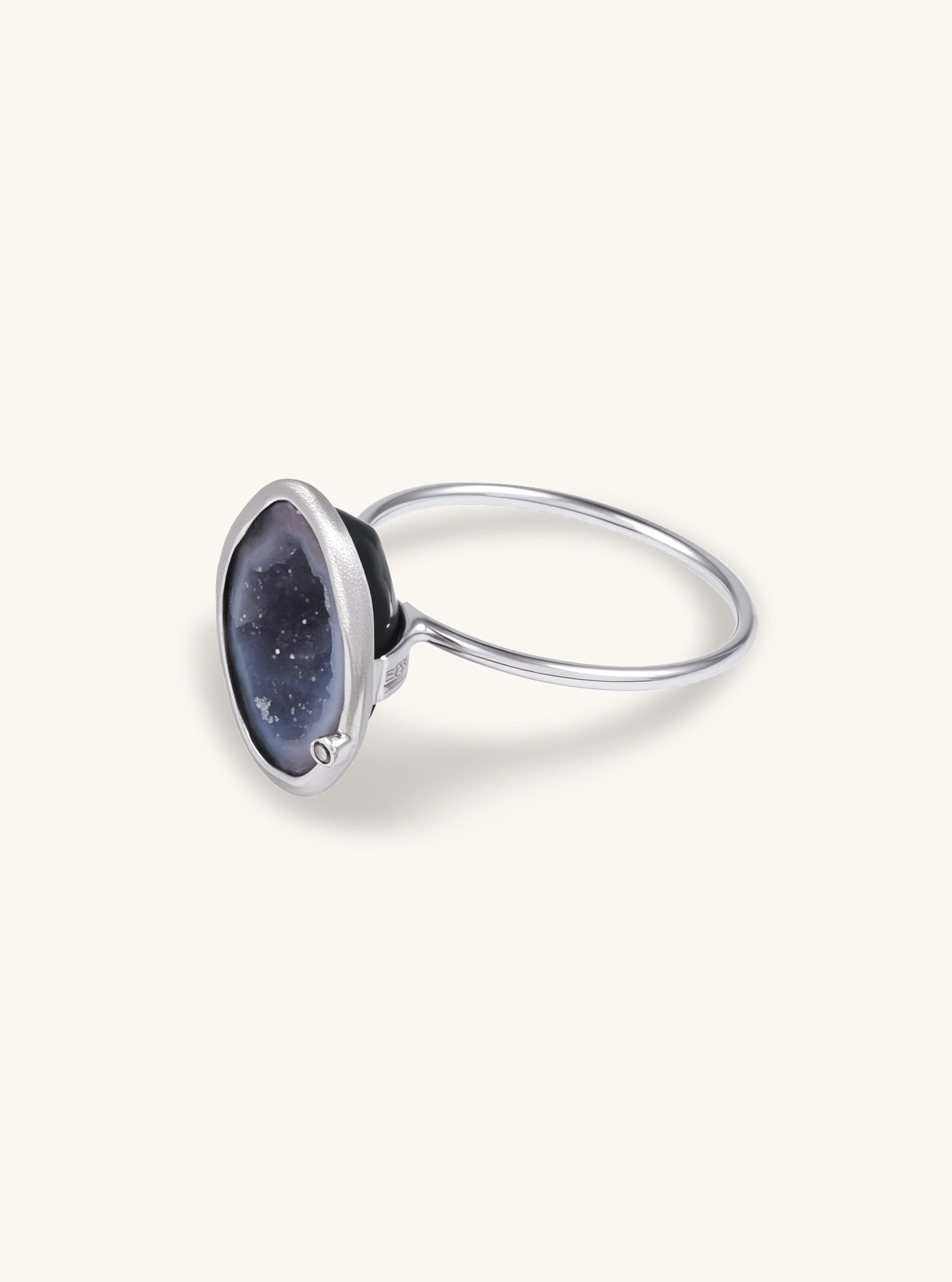 Inspired by natural textures, this Tabasco geode reveals raw crystalline brilliance beneath smooth 18k solid white gold. A single diamond accent completes this fusion of untamed beauty and refined form.