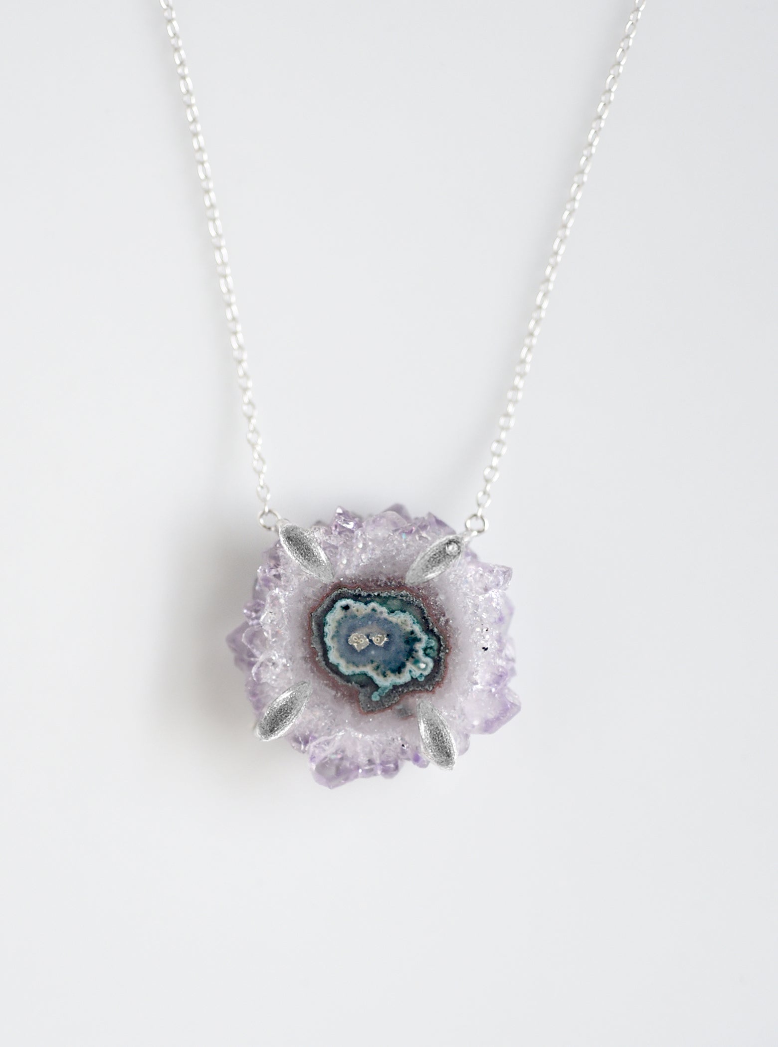 Necklace featuring a one of a kind natural amethyst quartz stalactite flower. This unique stone is formed when the amethyst crystals form on the outside of an agate slice instead of inside of a hollow stone, which creates a geode.