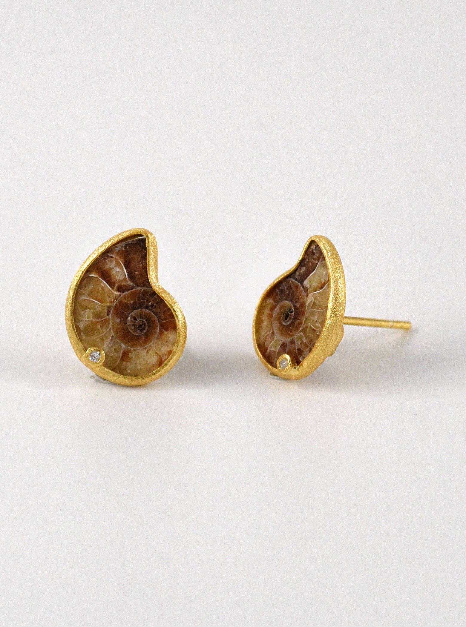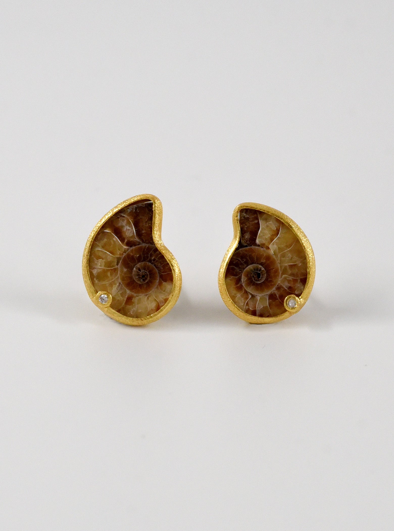 Earrings featuring a pair of natural ammonite fossil in hand crafted bezel settings brushed finished with sparkling natural diamond accents stud back closures.