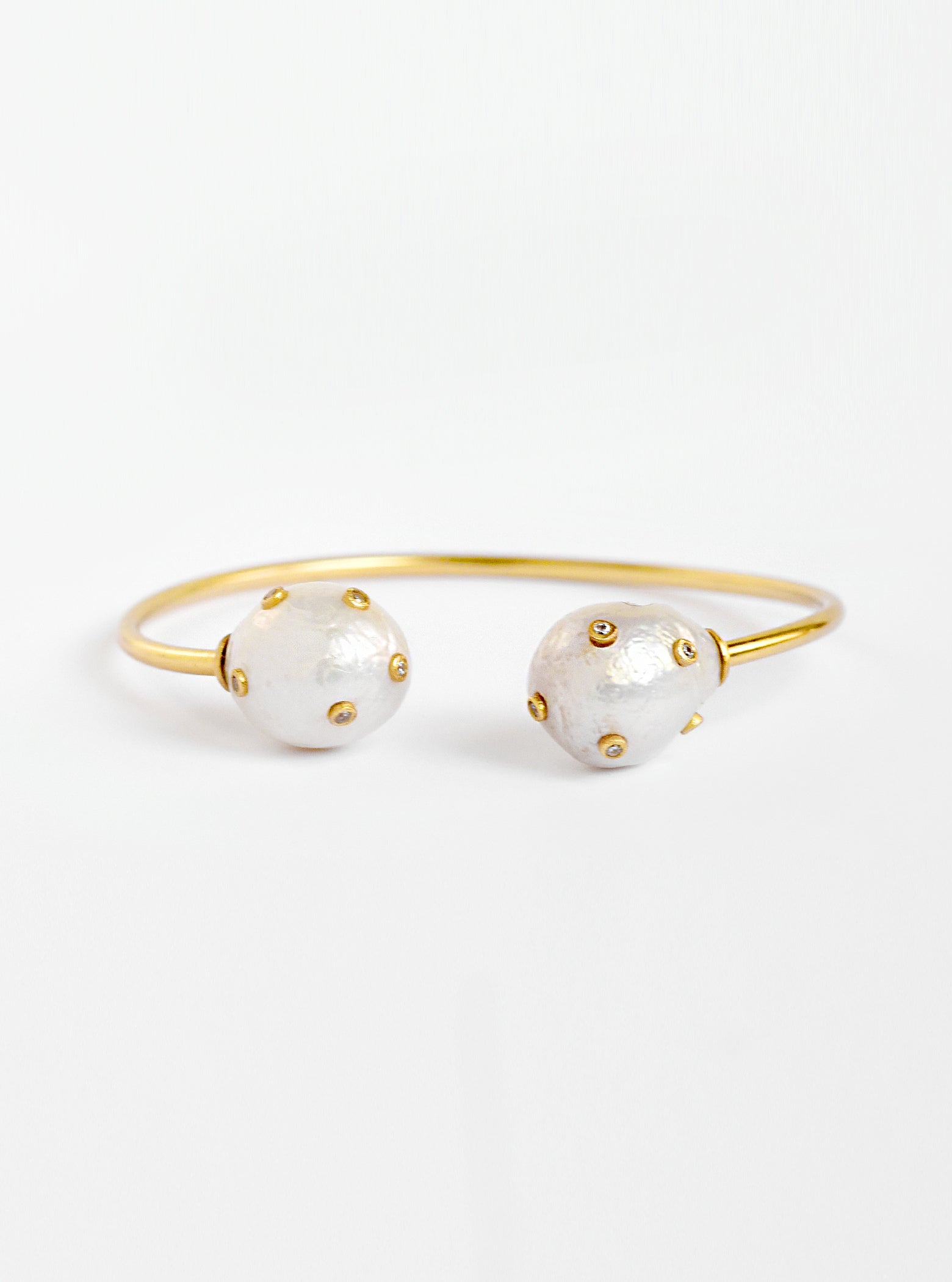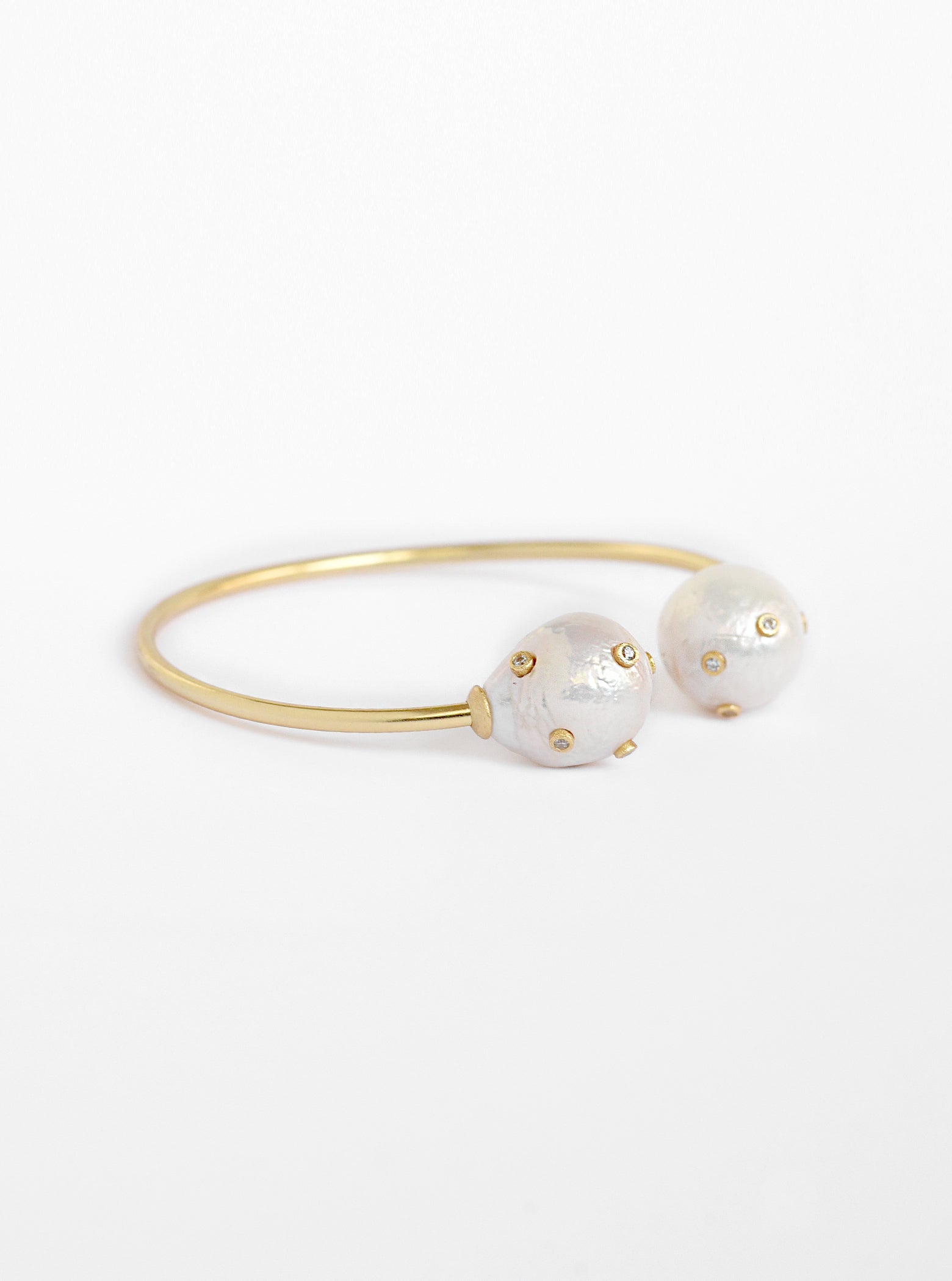 This gorgeous bangle bracelet features two natural baroque pearls, hand set with cz embedded inside and attached to a flexible Sterling Silver wire bangle.