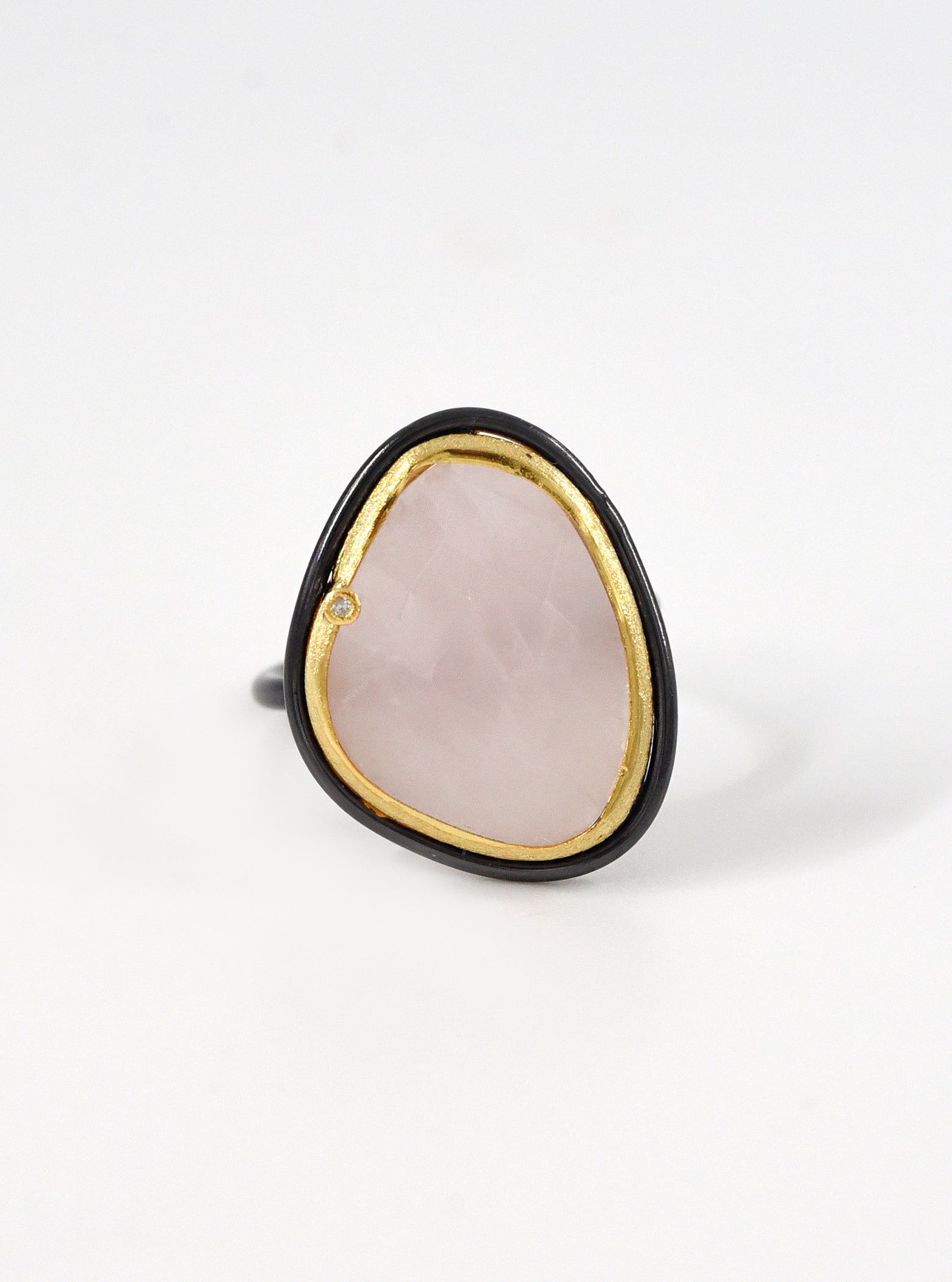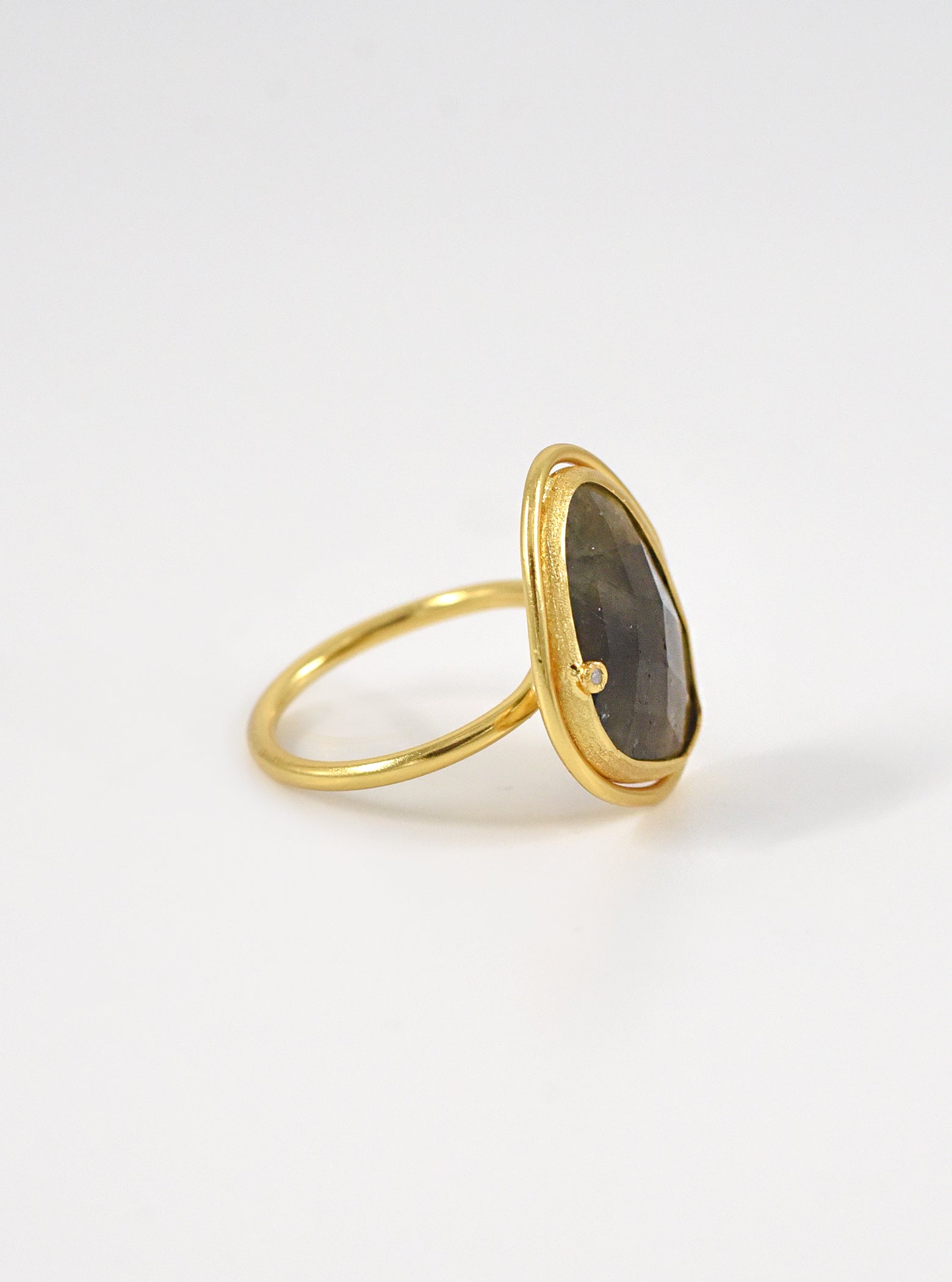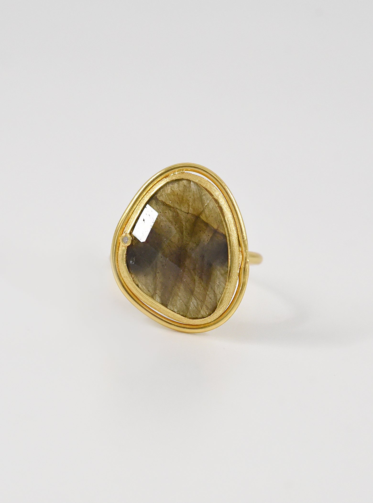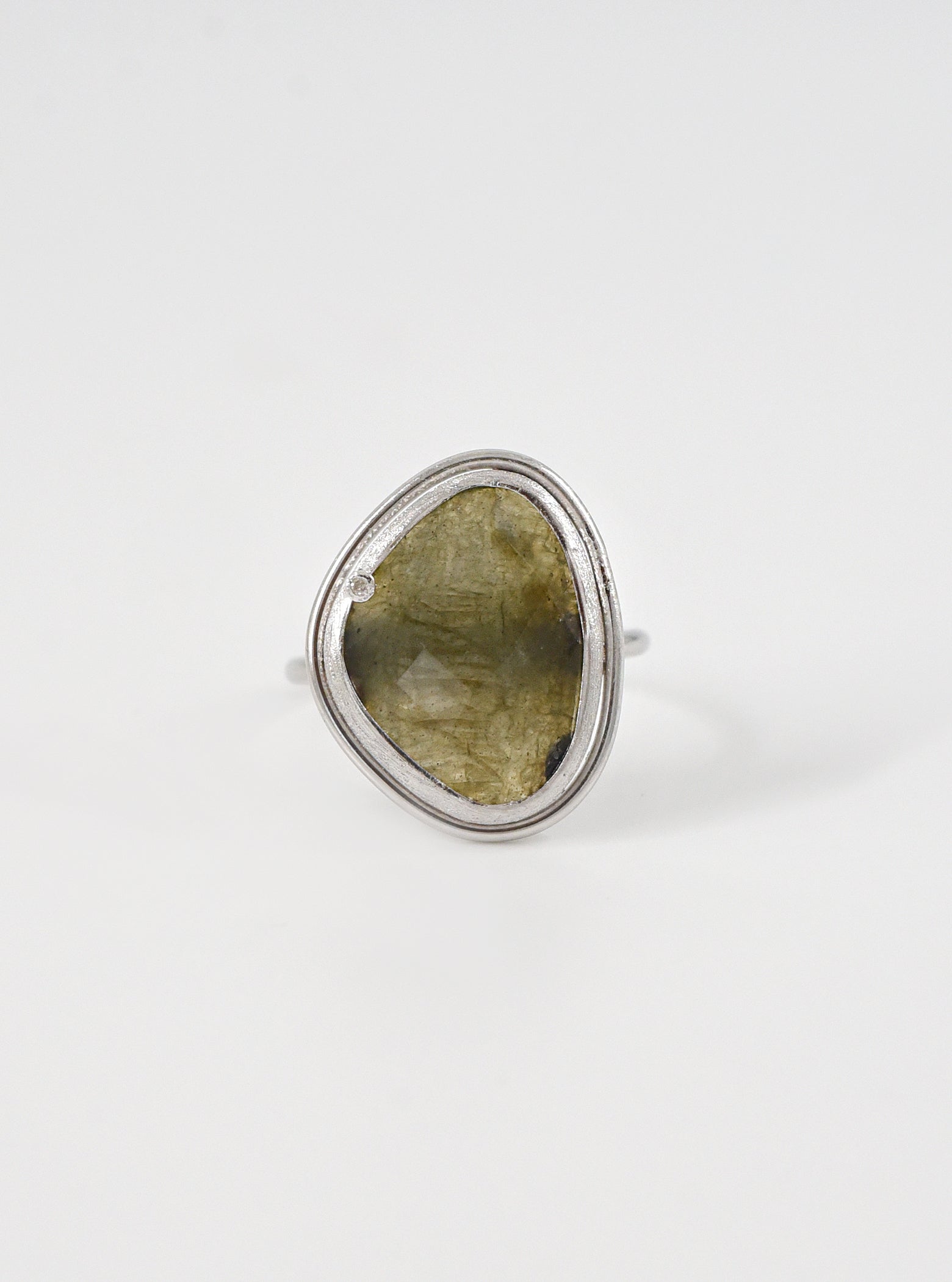 This handcrafted ring features a beautifully faceted, kidney-shaped natural gemstone, uniquely chosen for its organic curves and inner radiance. A genuine diamond accent adds a delicate sparkle, enhancing the ring’s elegant, modern design. The stone is set in a sculptural, handmade bezel that highlights its natural shape and character. Finished adjustable band, this piece offers both comfort and versatility—made to fit most finger sizes and perfect for everyday wear or special occasions.