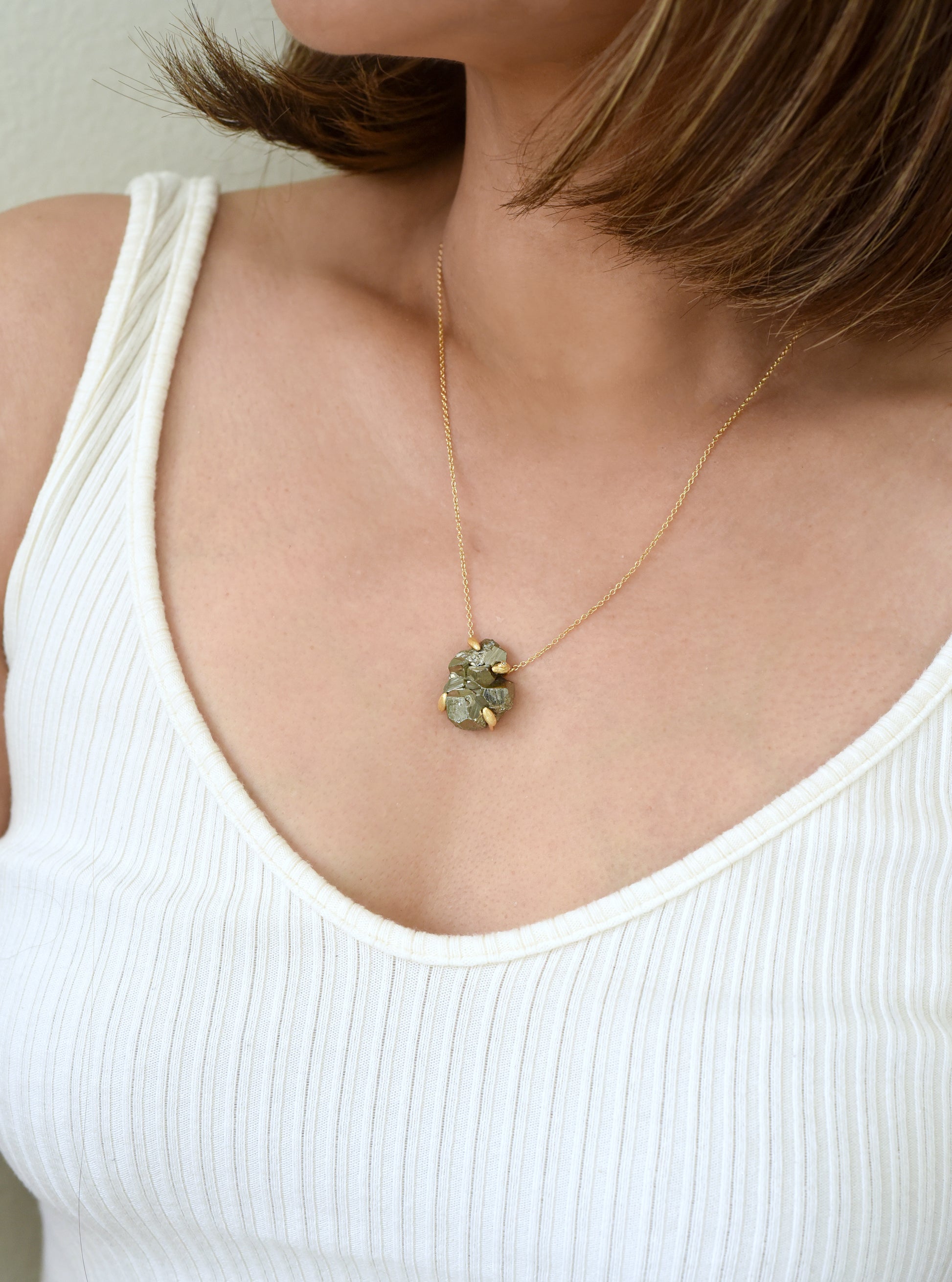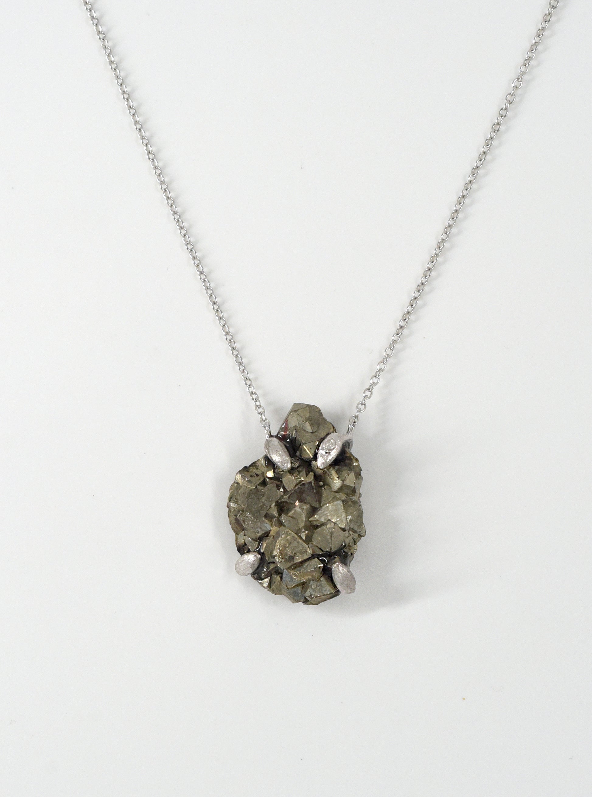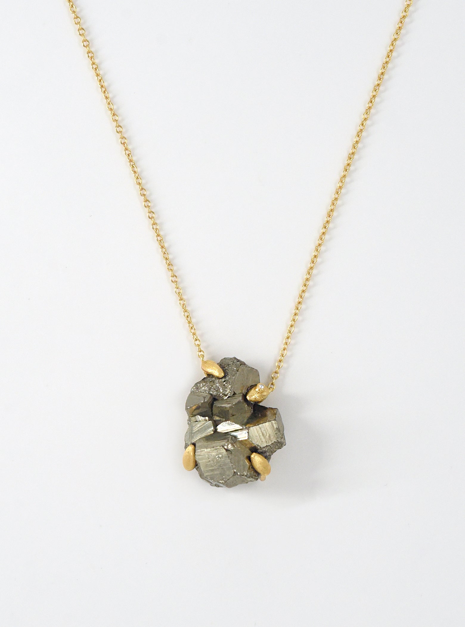 Necklace featuring a one of a kind natural pyrite specimen in a hand crafted bezel setting with diamond suspended from a delicate chain with two bezel set and a lobster claw closure.