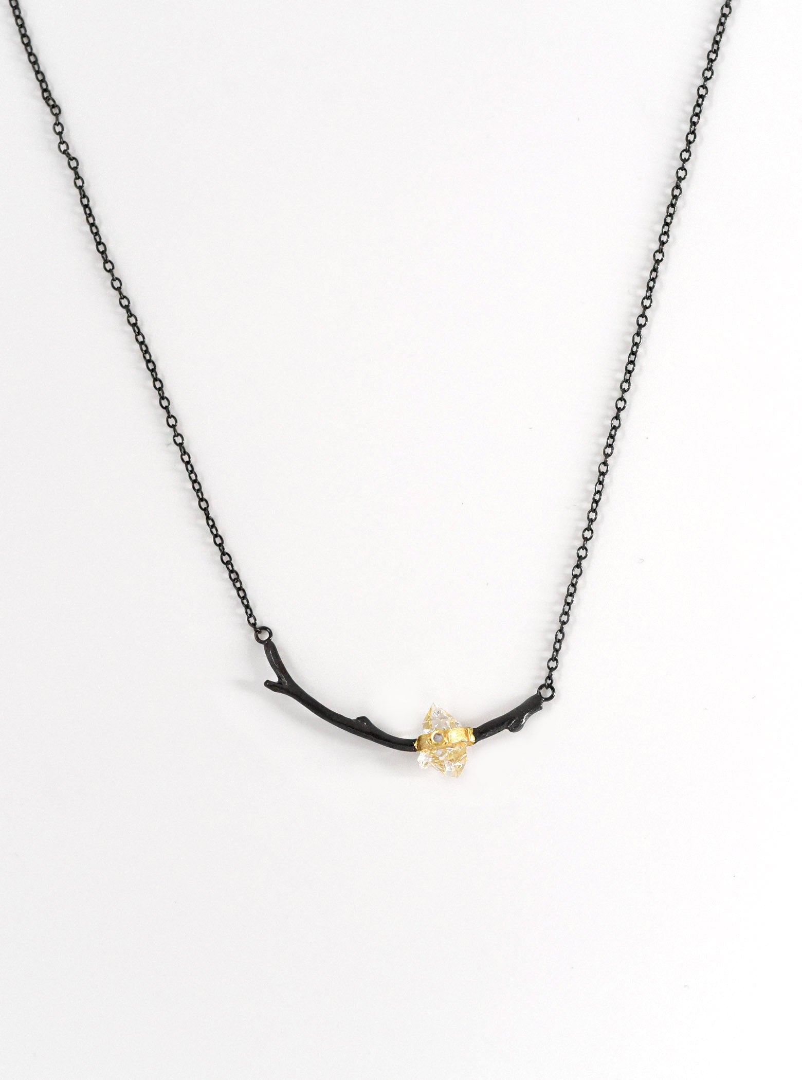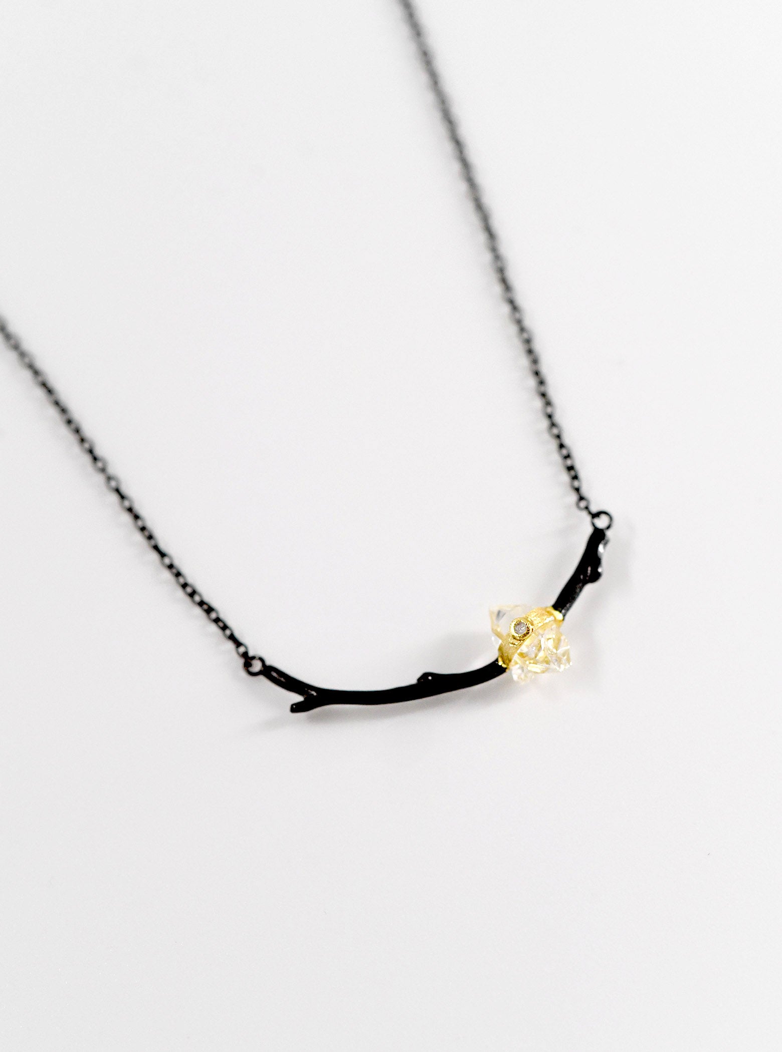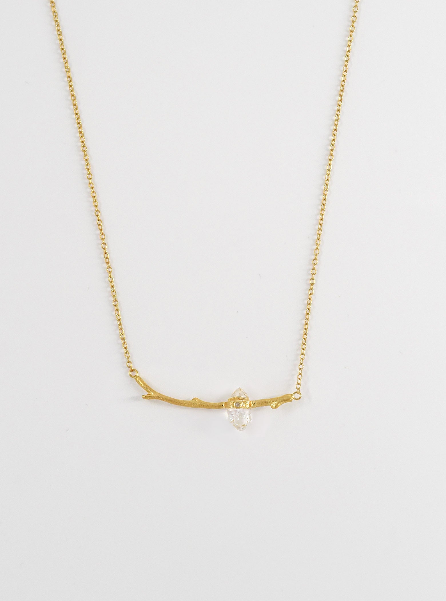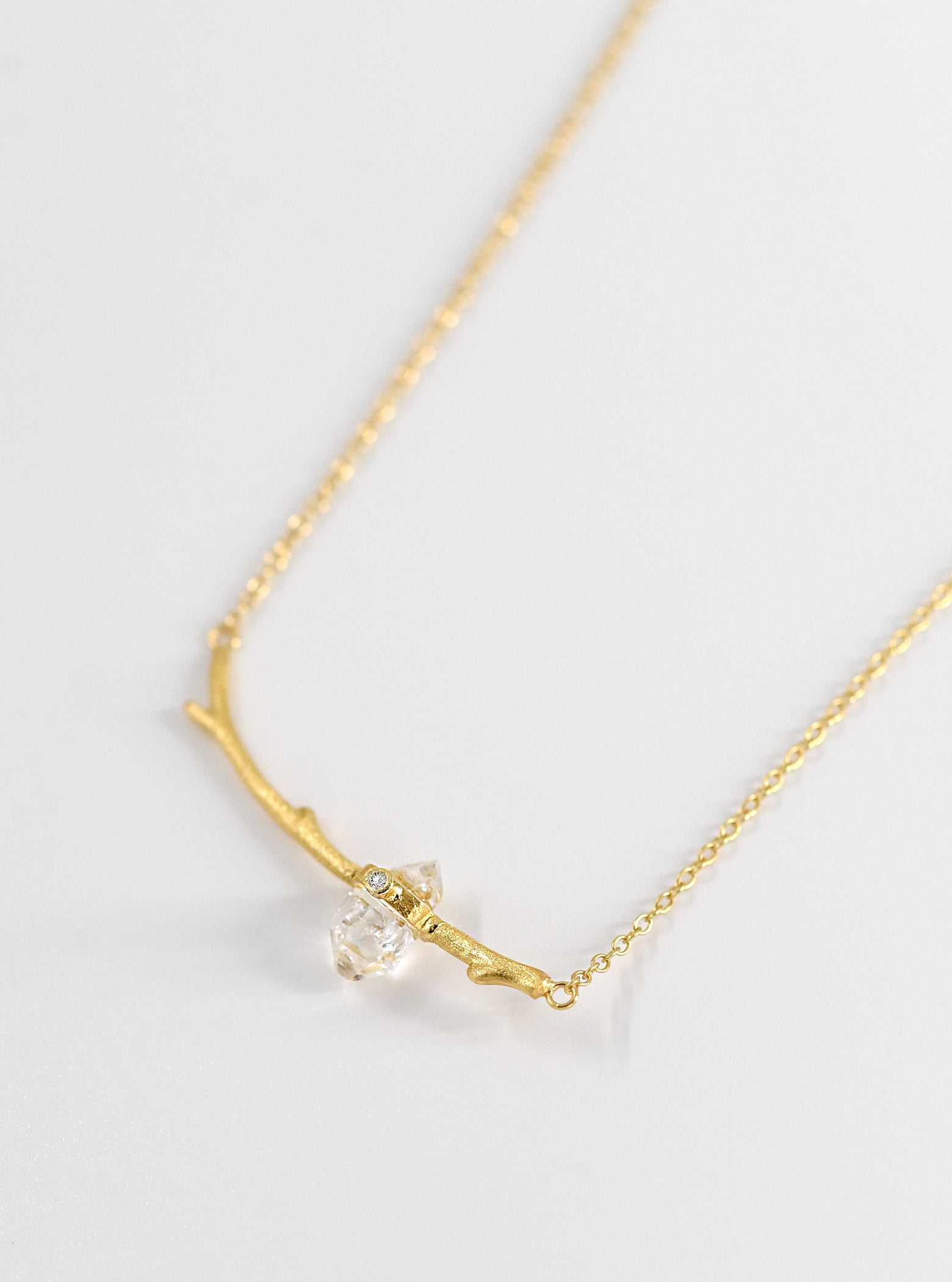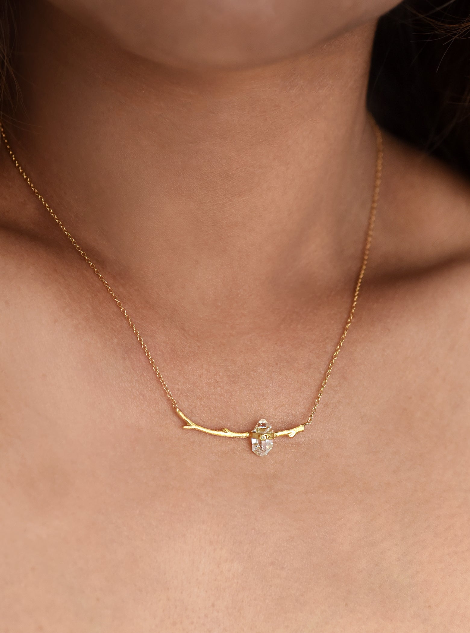Necklace featuring a one of a kind natural Herkimer diamond in a hand crafted branch setting, with a single diamond accent and brushed finished on a delicate chain with a closure.