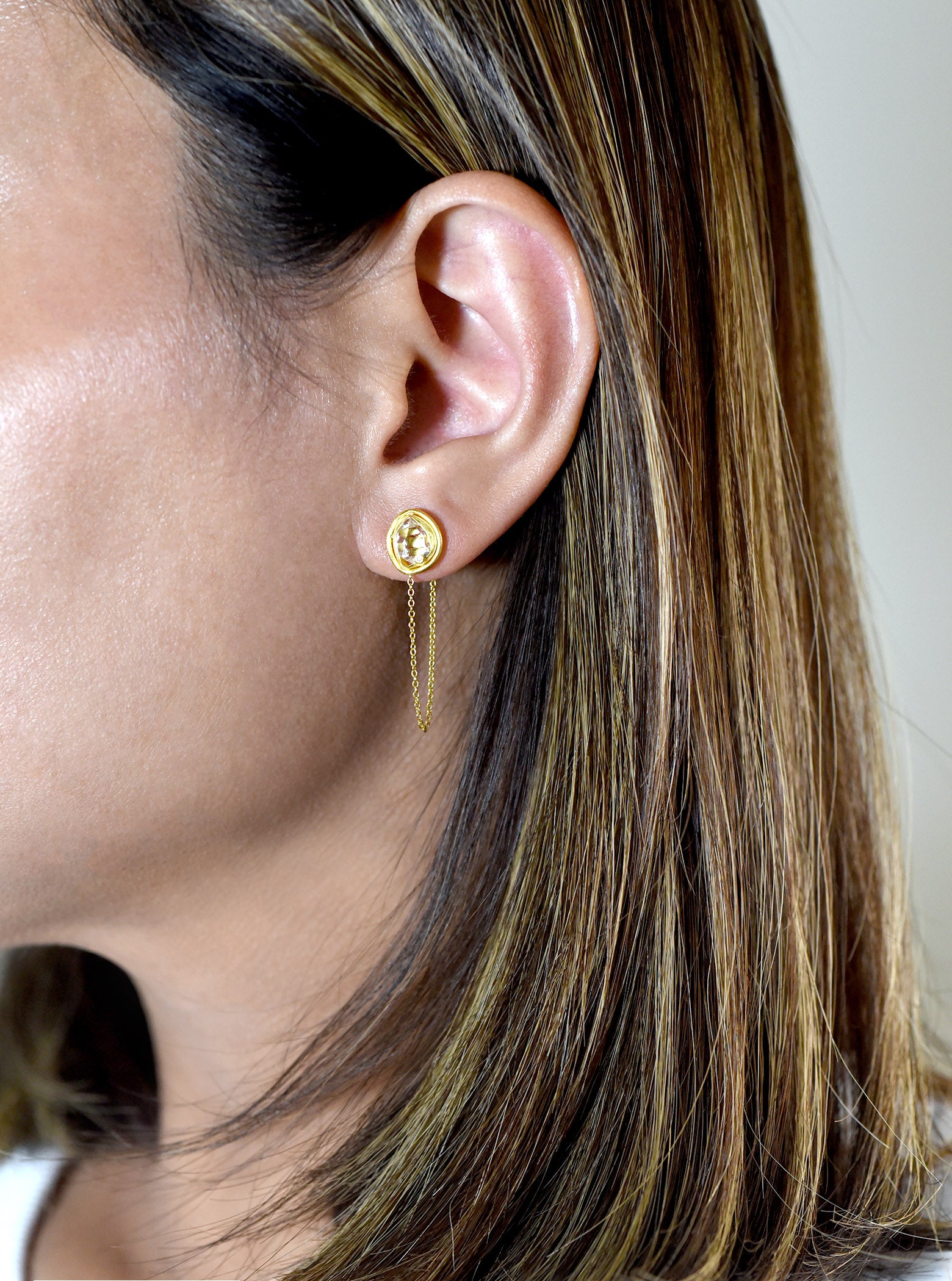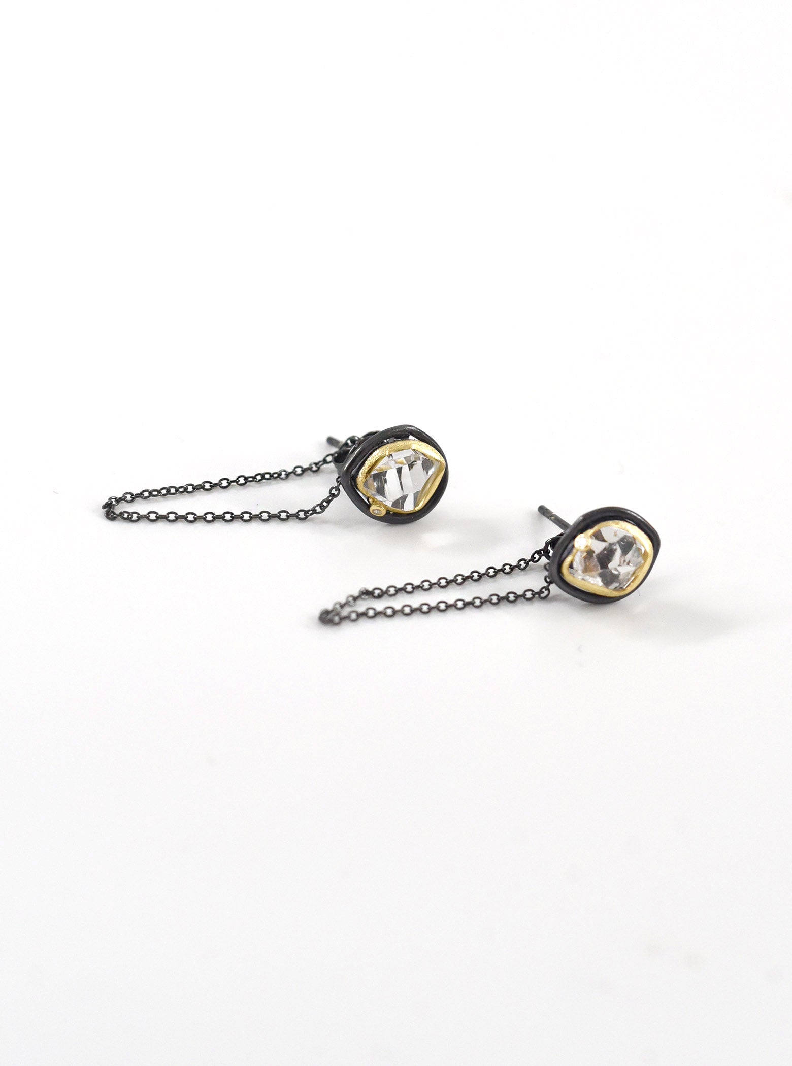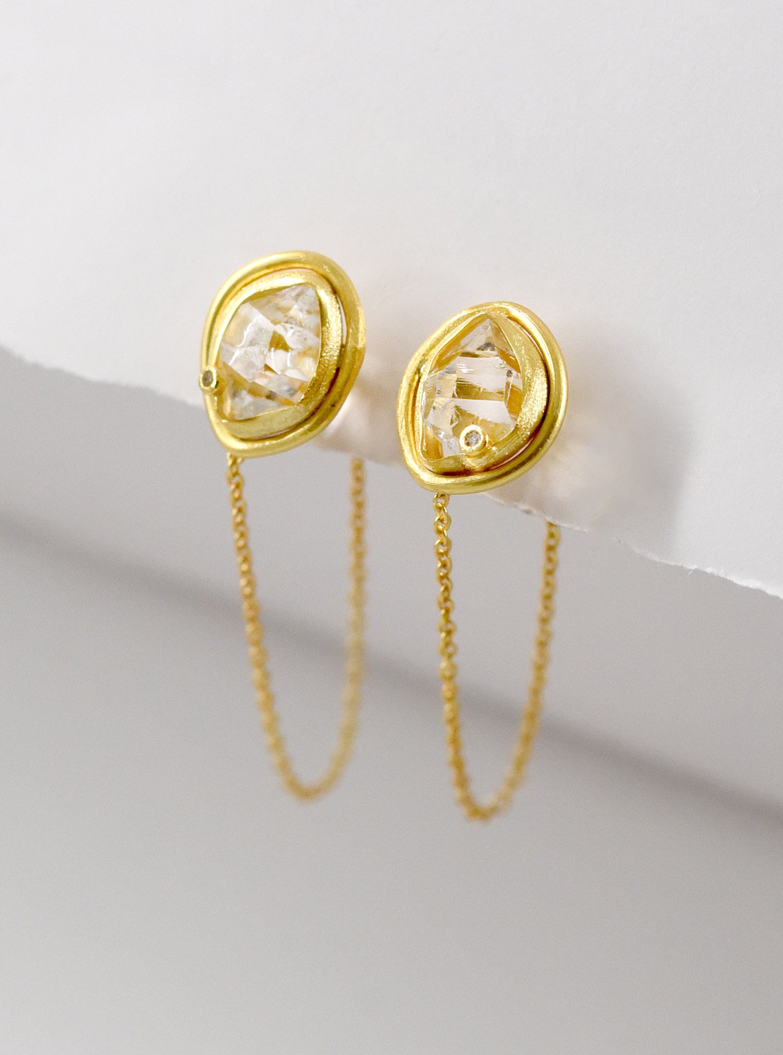 Featuring a one of a kind natural herkimer diamond with drop chain in a hand crafted setting, sparkling natural diamond accents and brushed finished with stud back closures.