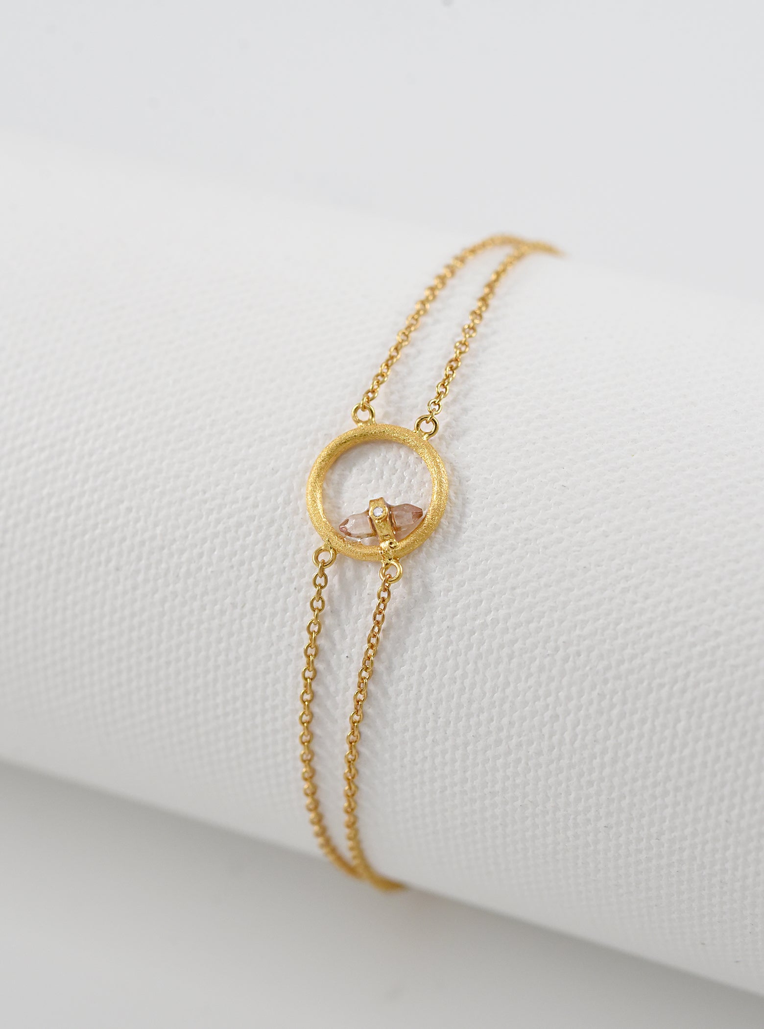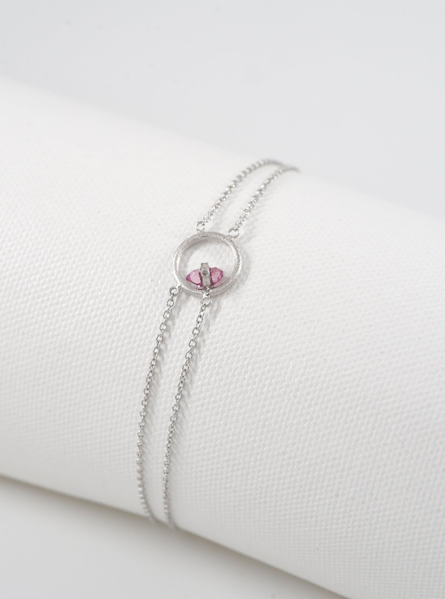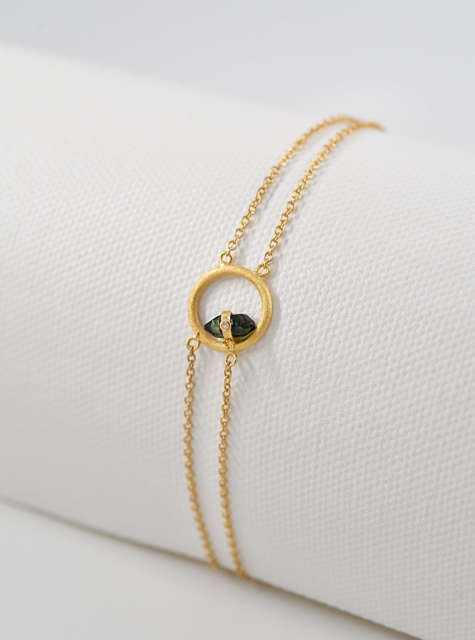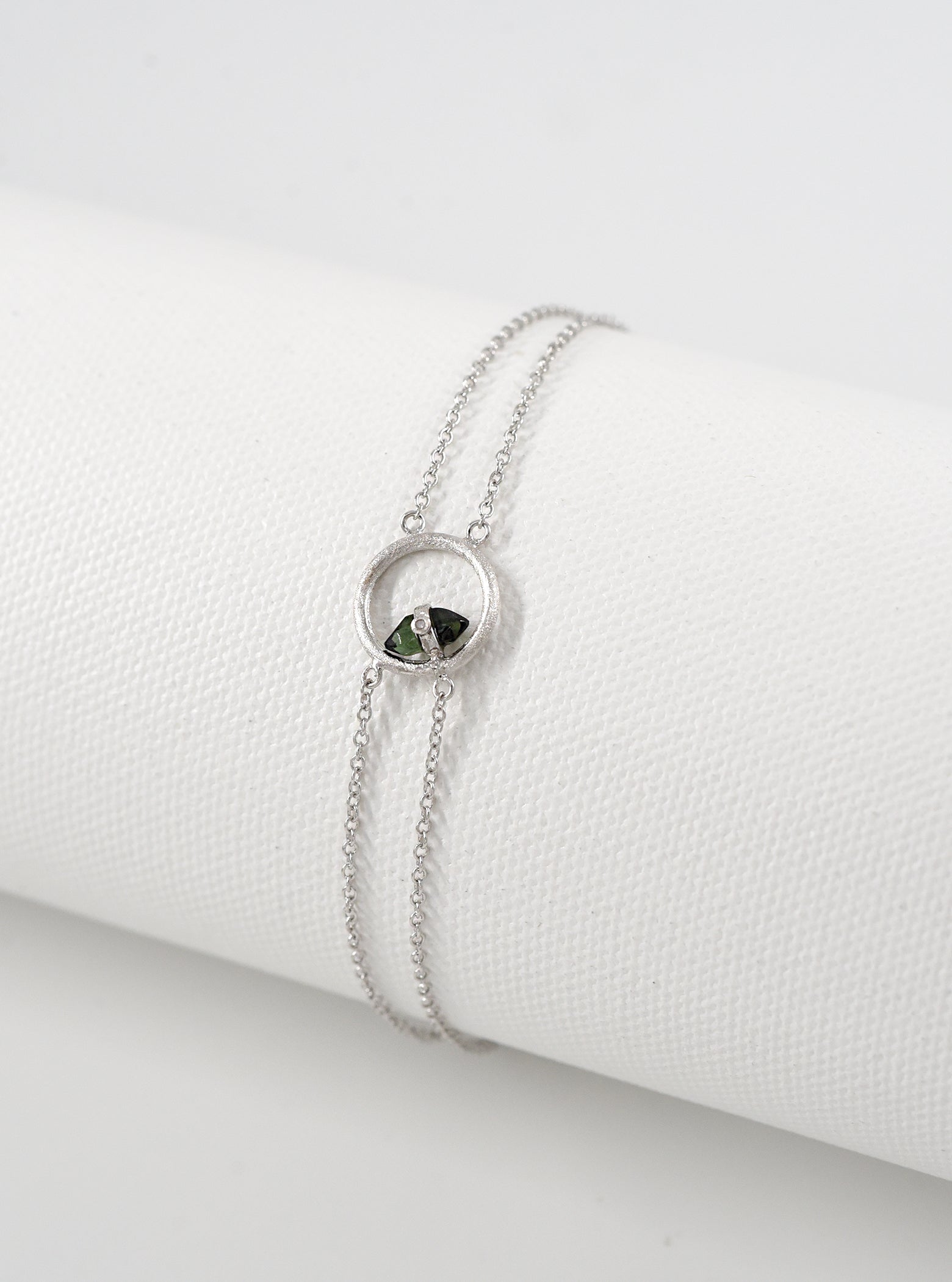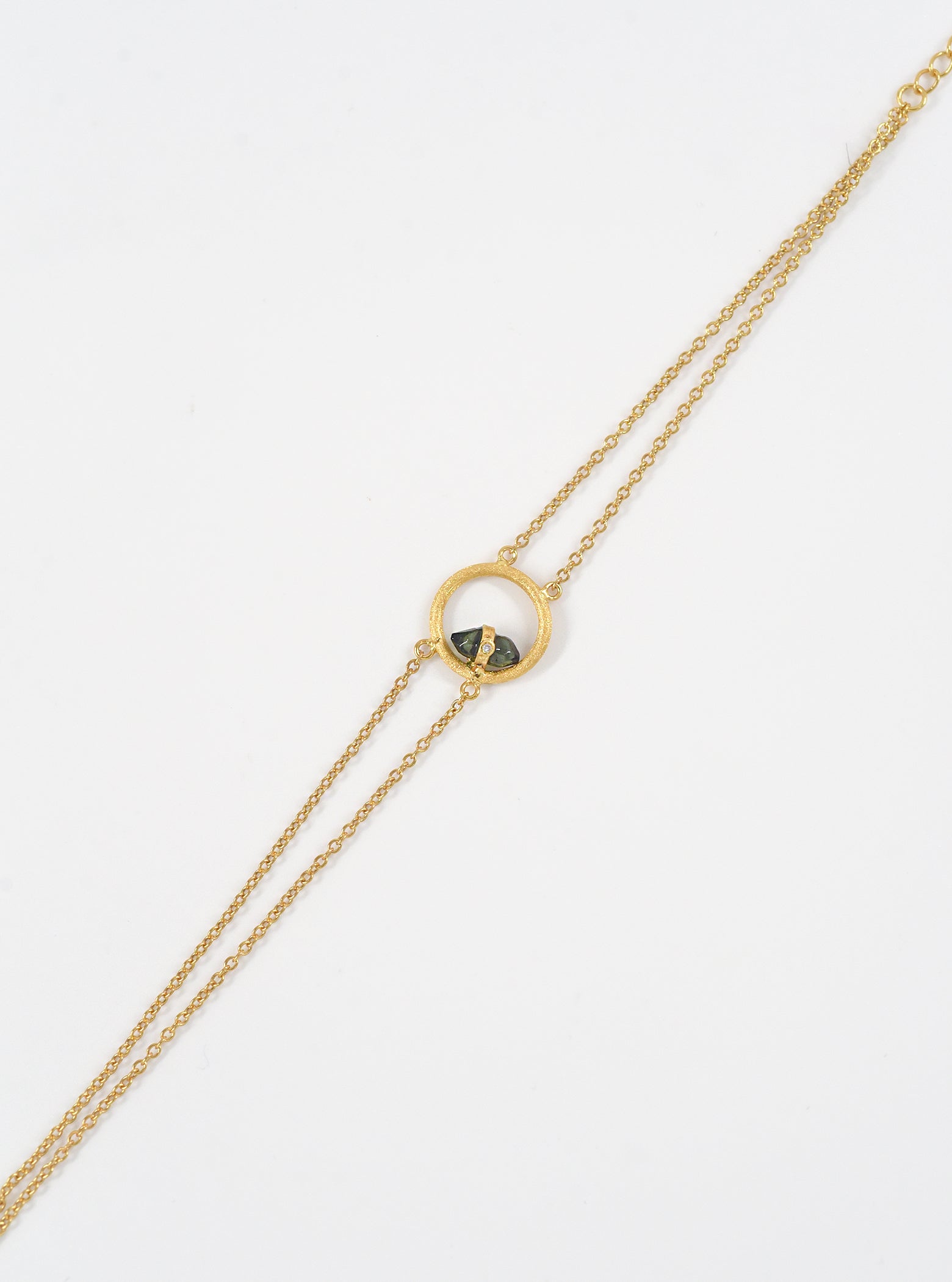 This versatile bracelet features a natural Tourmaline in a natural cut with a Genuine Diamond detail, suspended from a Halo ring connected to a delicate double bracelet chain with secure closure.
