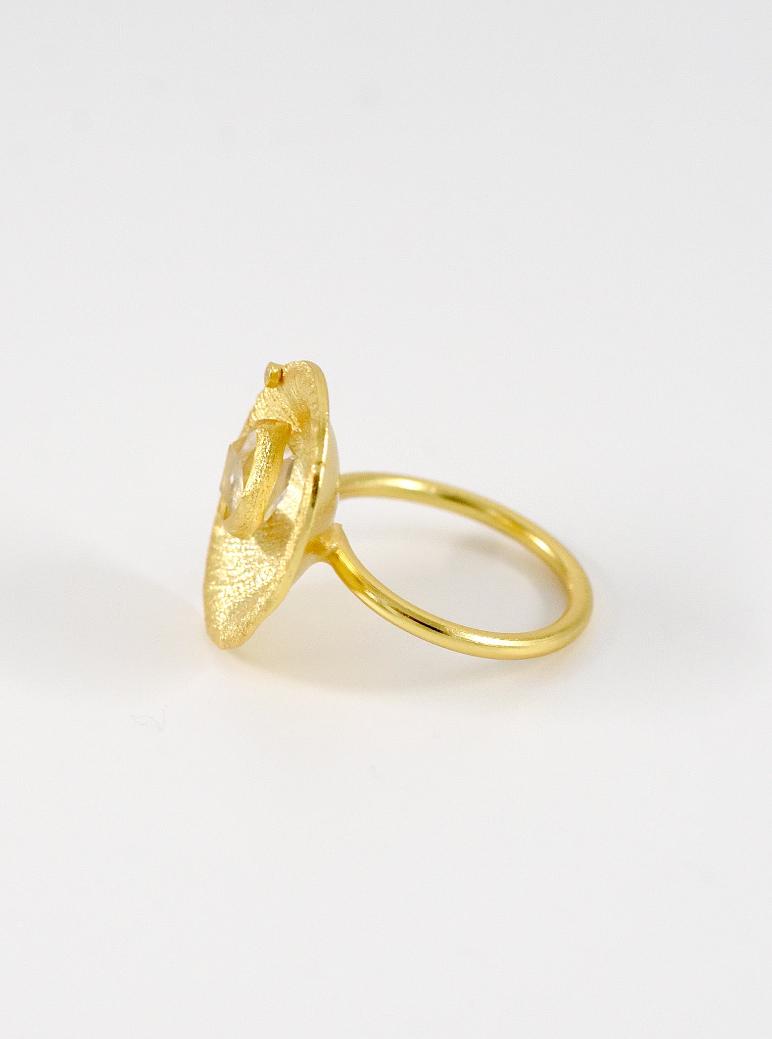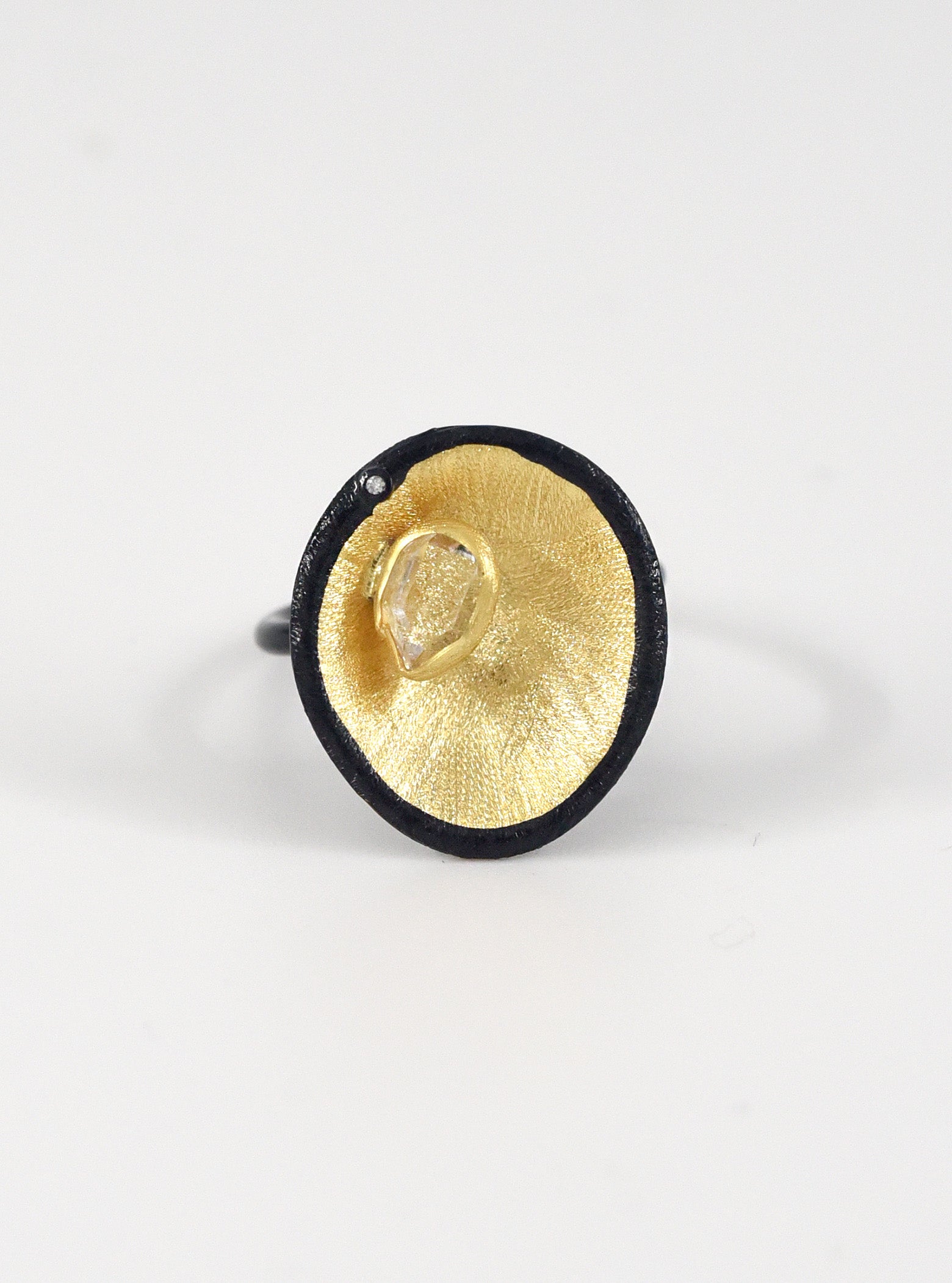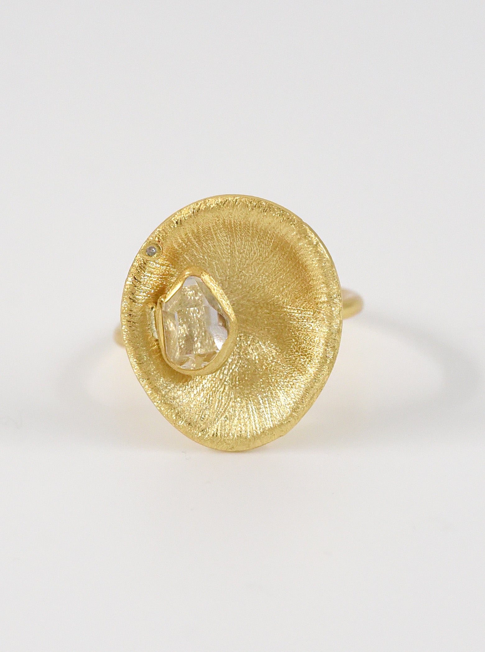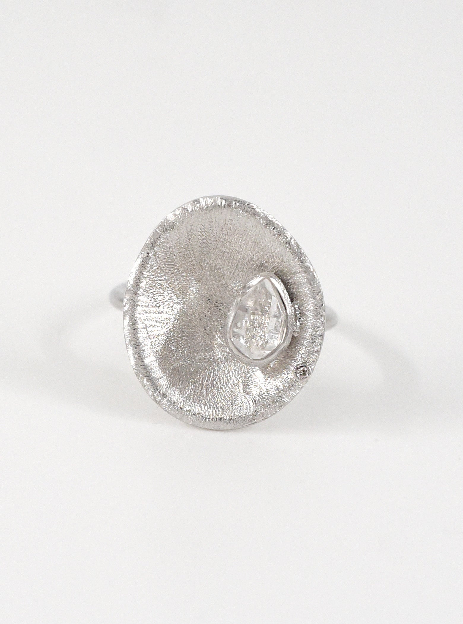 Ring featuring a one of a kind natural Herkimer diamond in a hand crafted setting, with a single diamond accent and brushed finished.