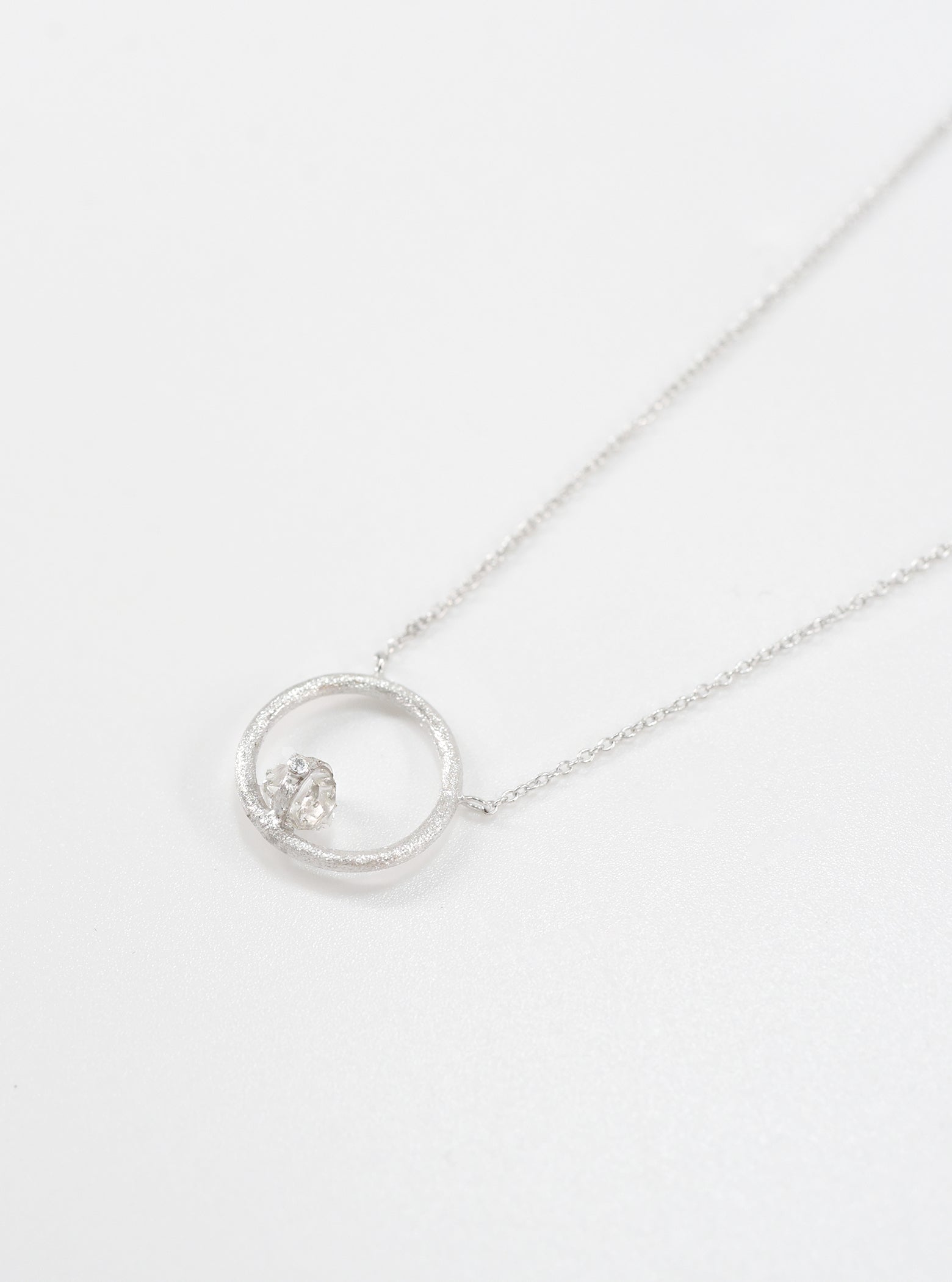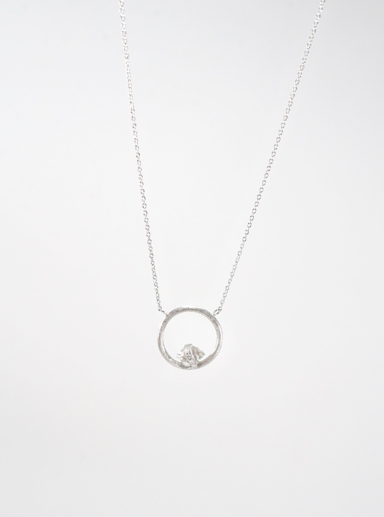 Necklace featuring a one of a kind natural Herkimer diamond in a hand crafted delicate chain setting, with a single diamond accent and brushed finished.