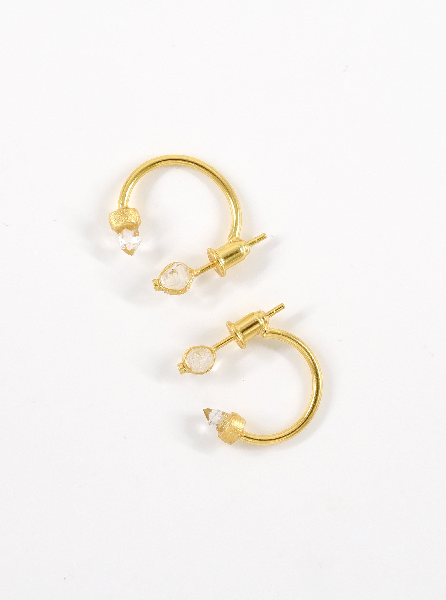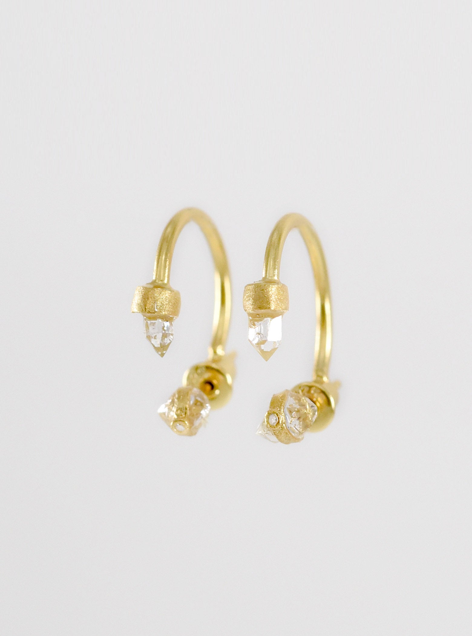 Featuring a one of a kind natural herkimer diamond in a hand crafted hoop setting, sparkling natural diamond accents and brushed finished with stud back closures.