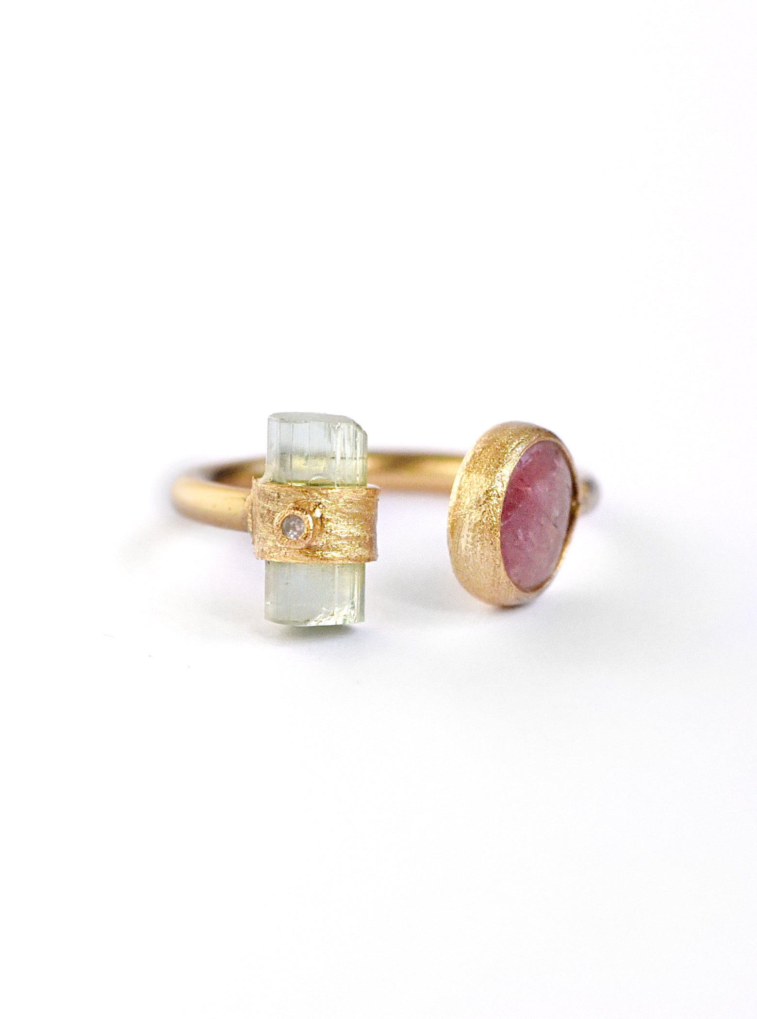Ring featuring two one of a kind natural tourmaline crystals in hand crafted setting with diamond.