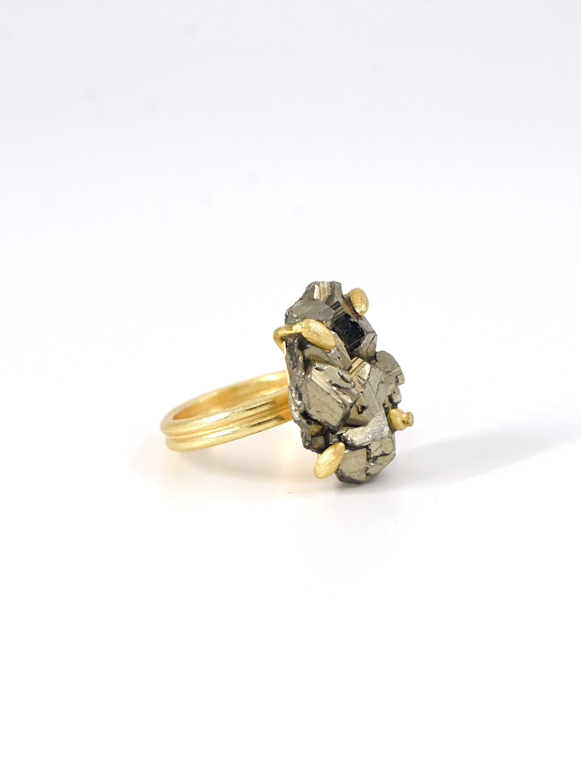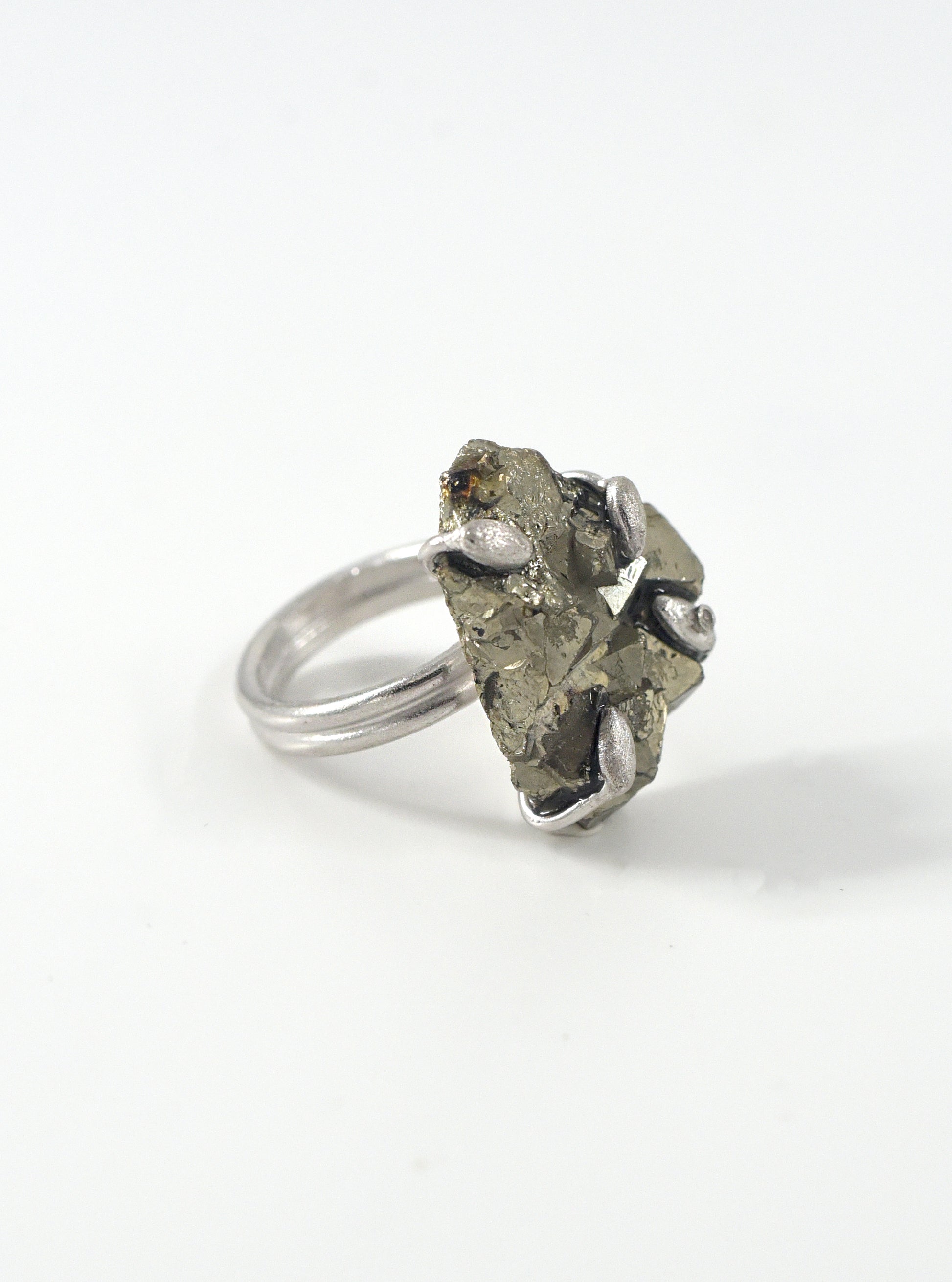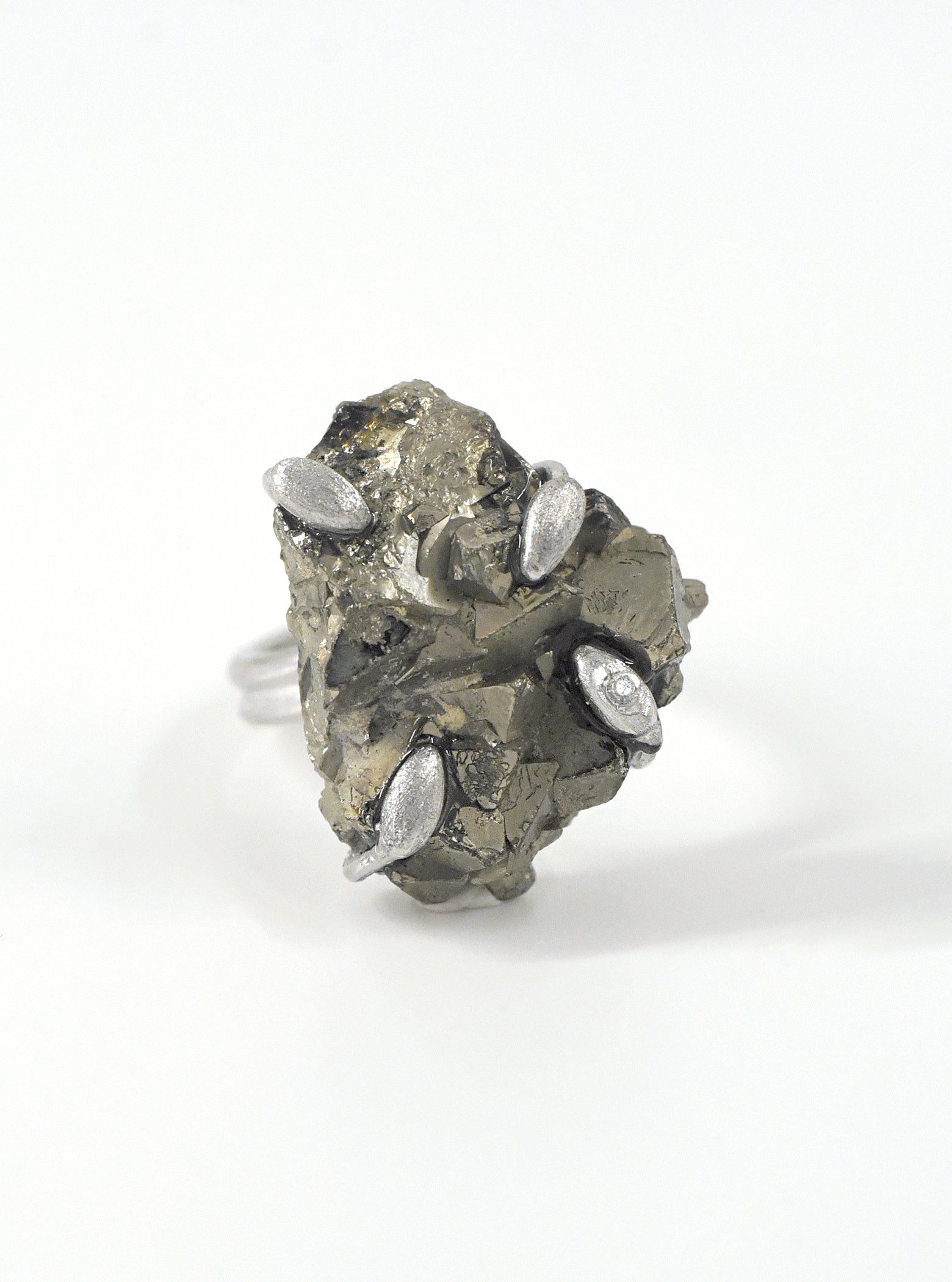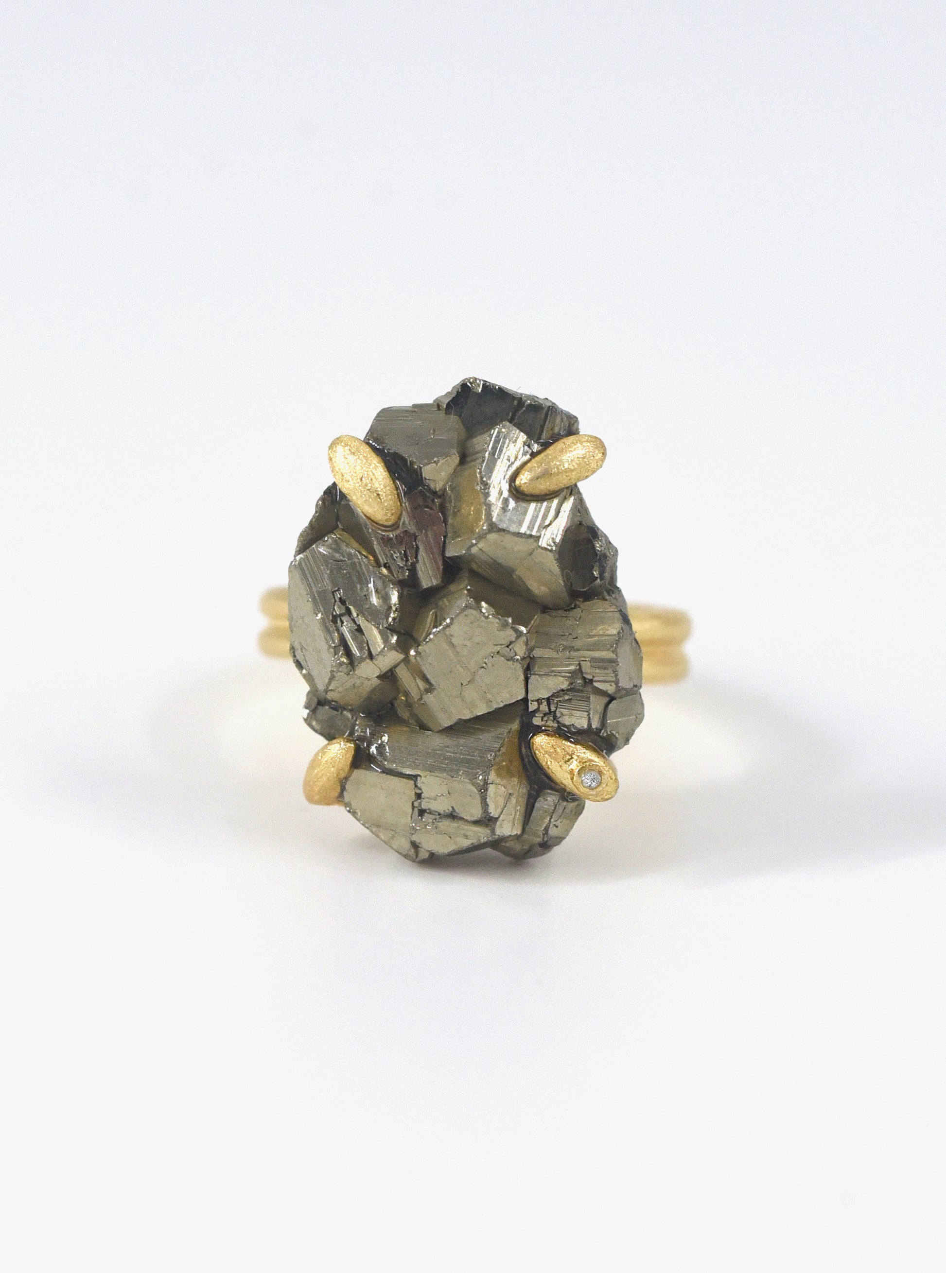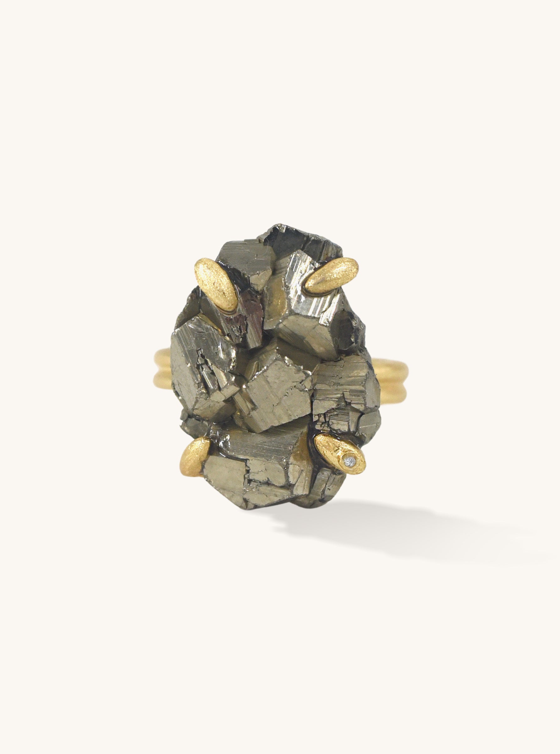 Ring featuring a one of a kind natural pyrite specimen in a hand crafted setting, with a single diamond accent and brushed finished.