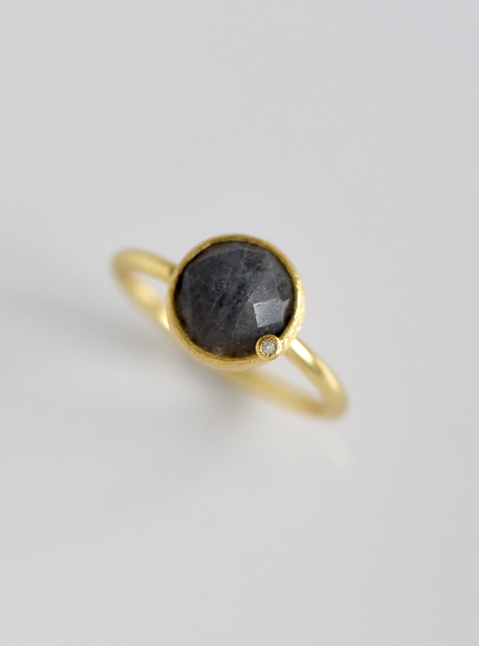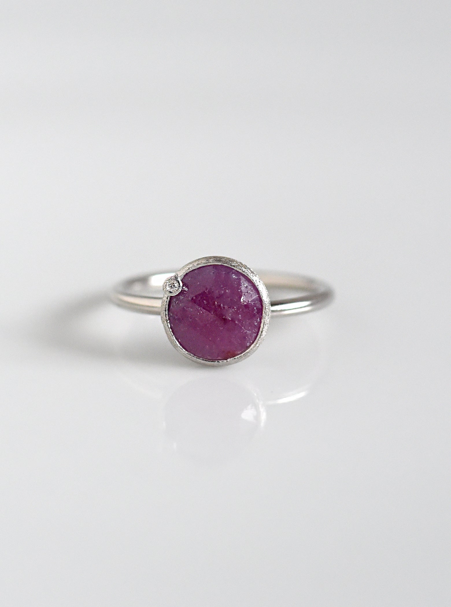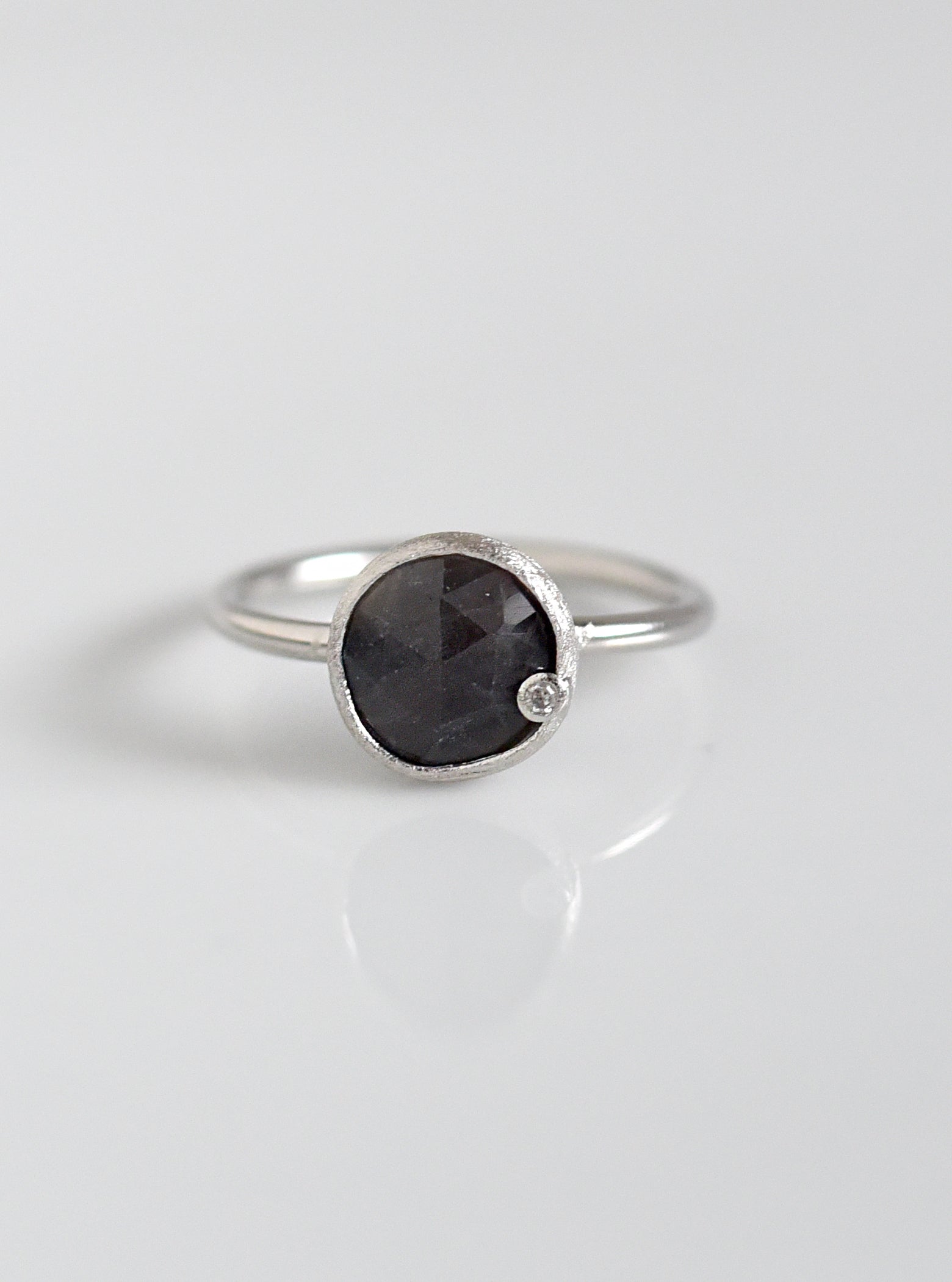 Ring featuring a round faceted natural sapphire in a bezel setting with a delicate, sparkling diamond accent.