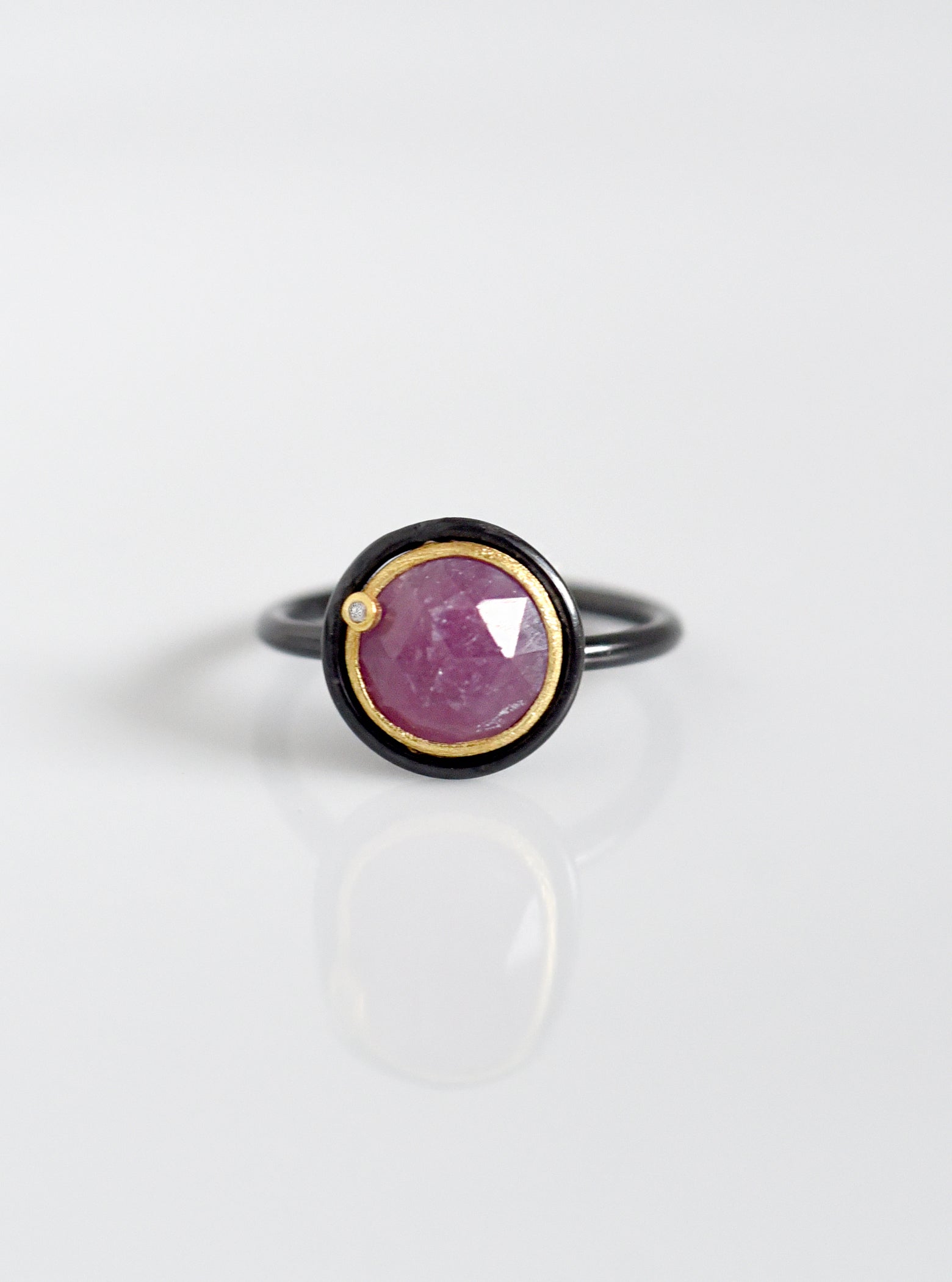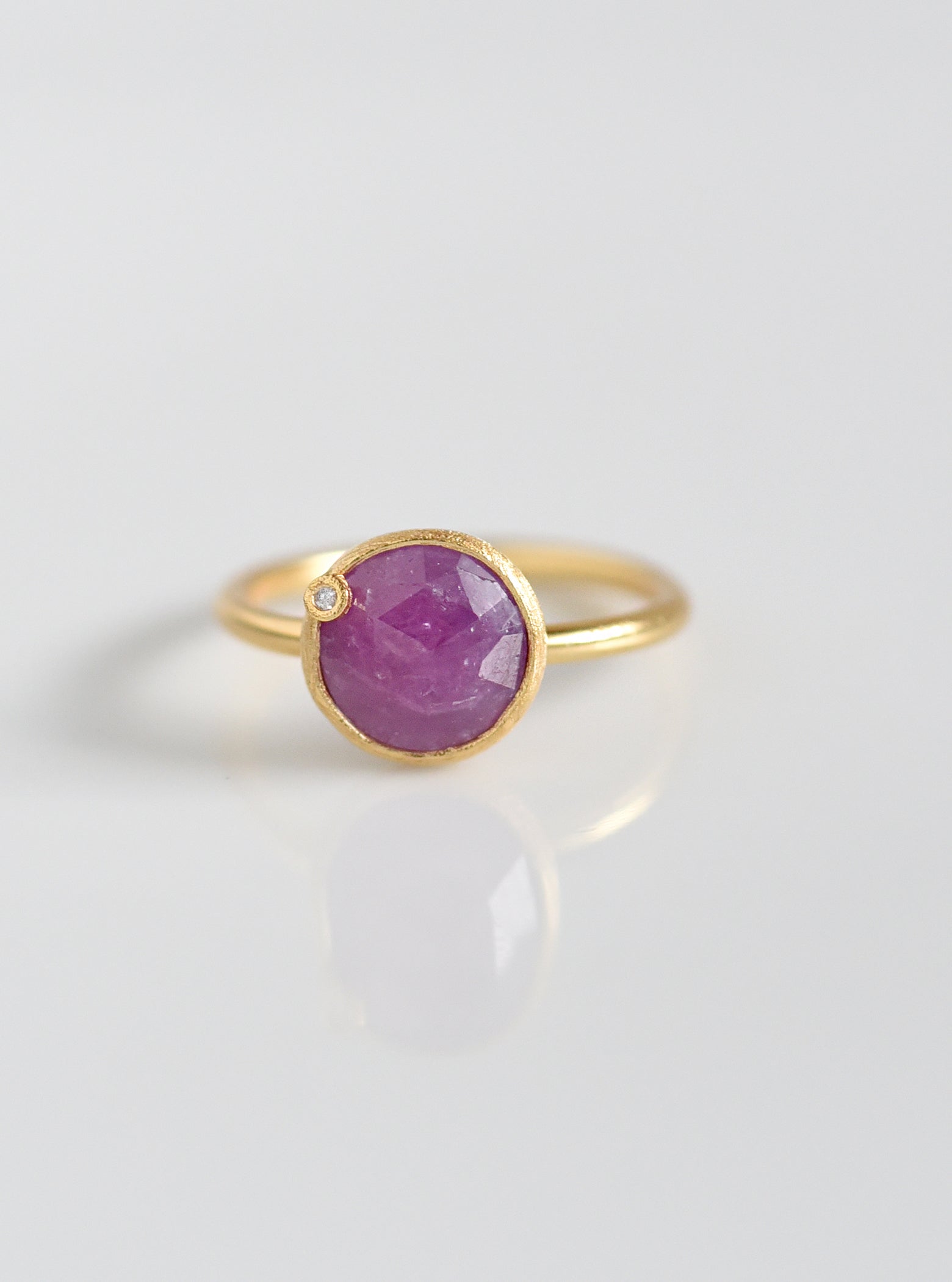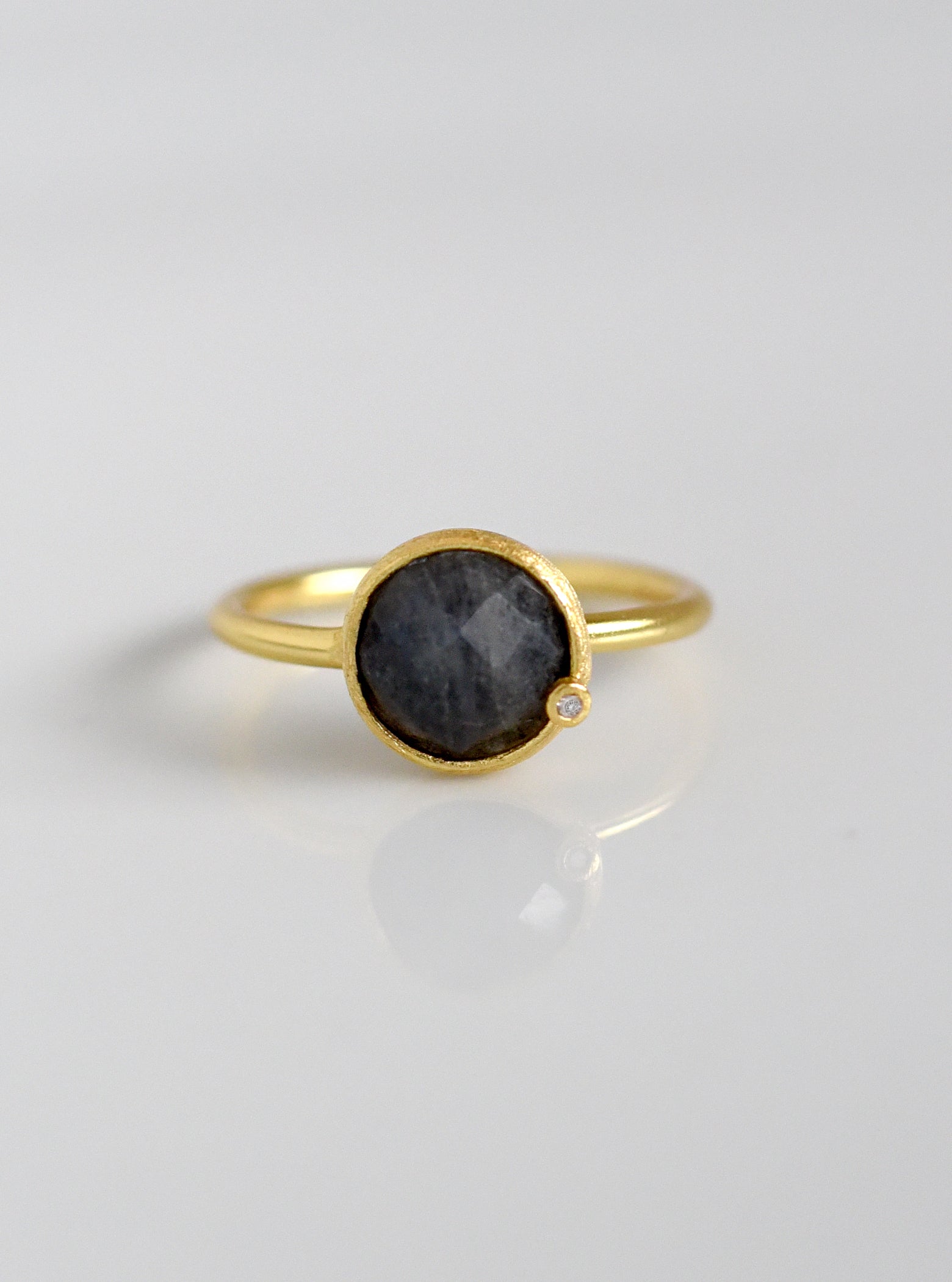 Ring featuring a round faceted natural sapphire in a bezel setting with a delicate, sparkling diamond accent.