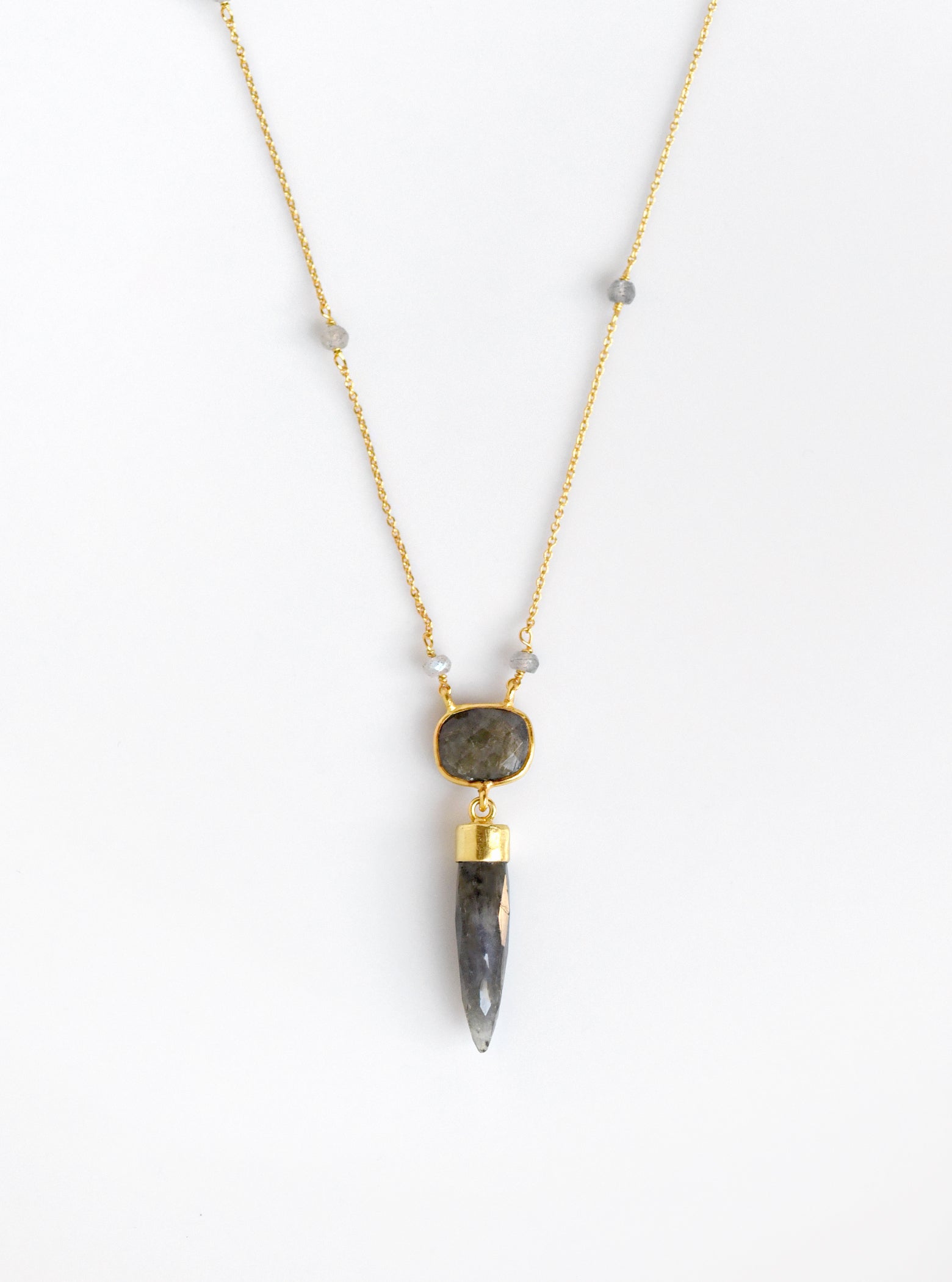 Necklace featuring a cushion shape, checkerboard faceted natural gemstone with dangling natural gemstone point on a delicate chain accented with hand wire-wrapped, faceted natural gemstone beads and a spring ring closure.
