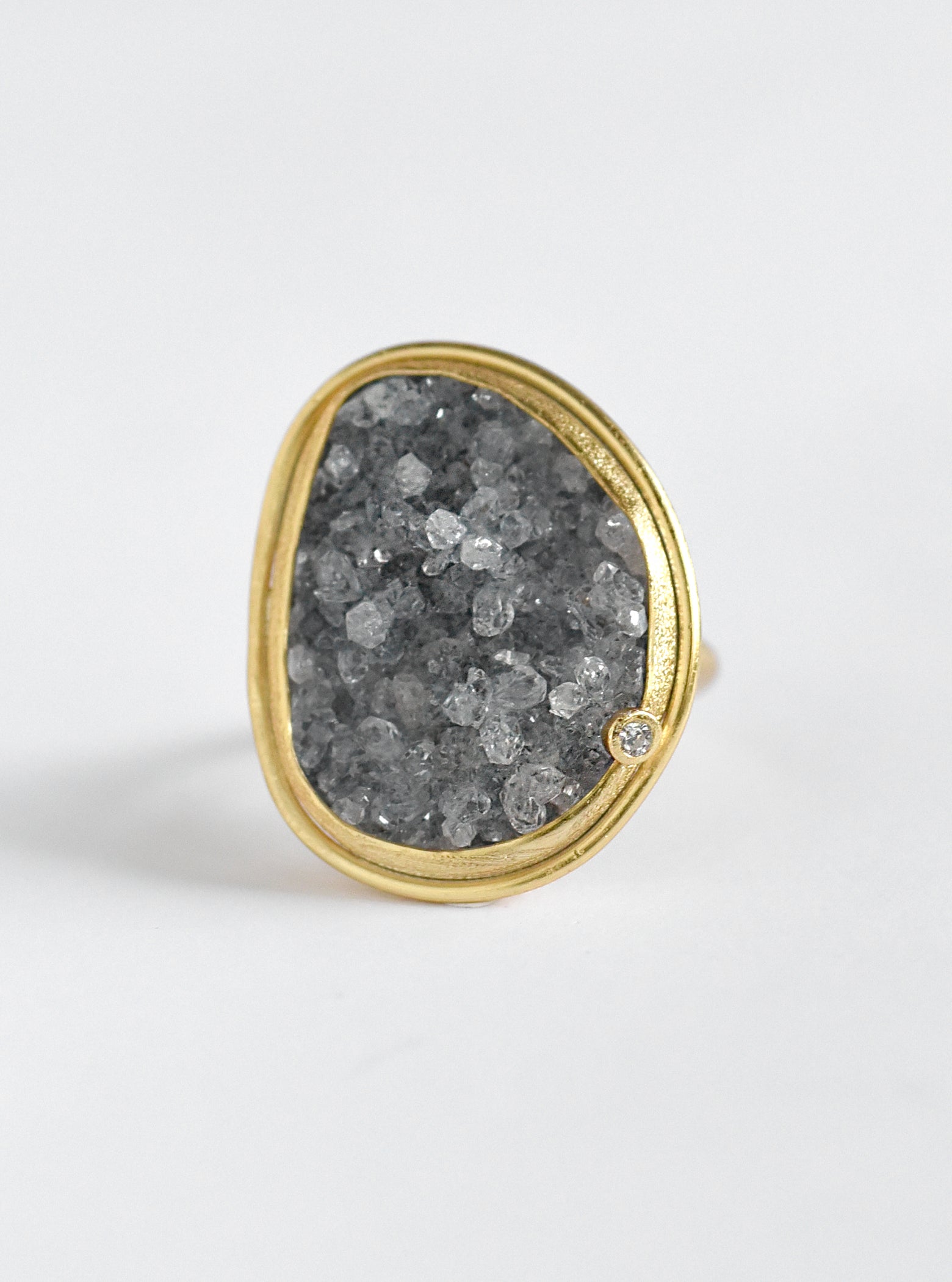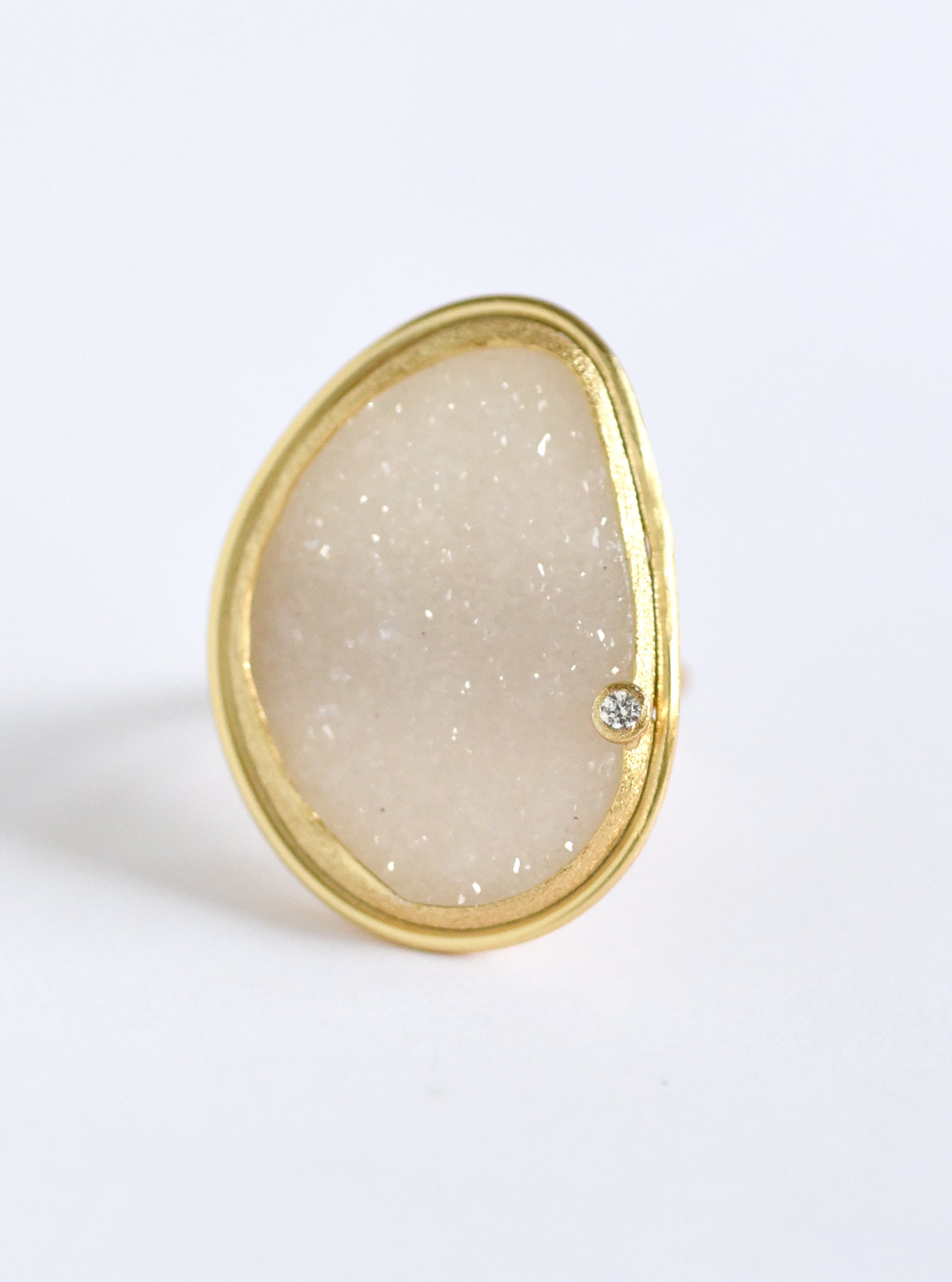 Ring featuring a large glittering free-form shape of natural quartz druzy in a hand crafted bezel setting.