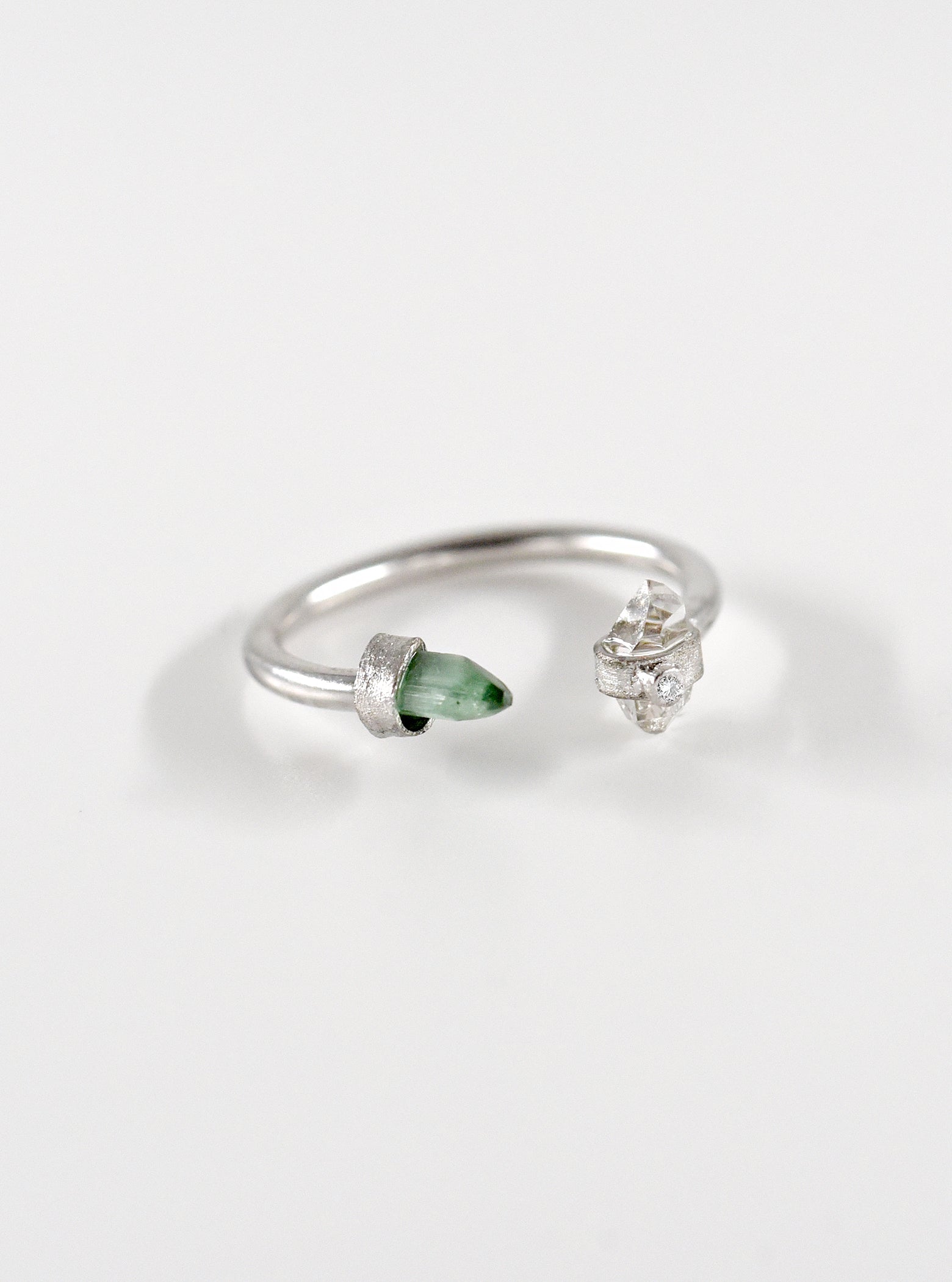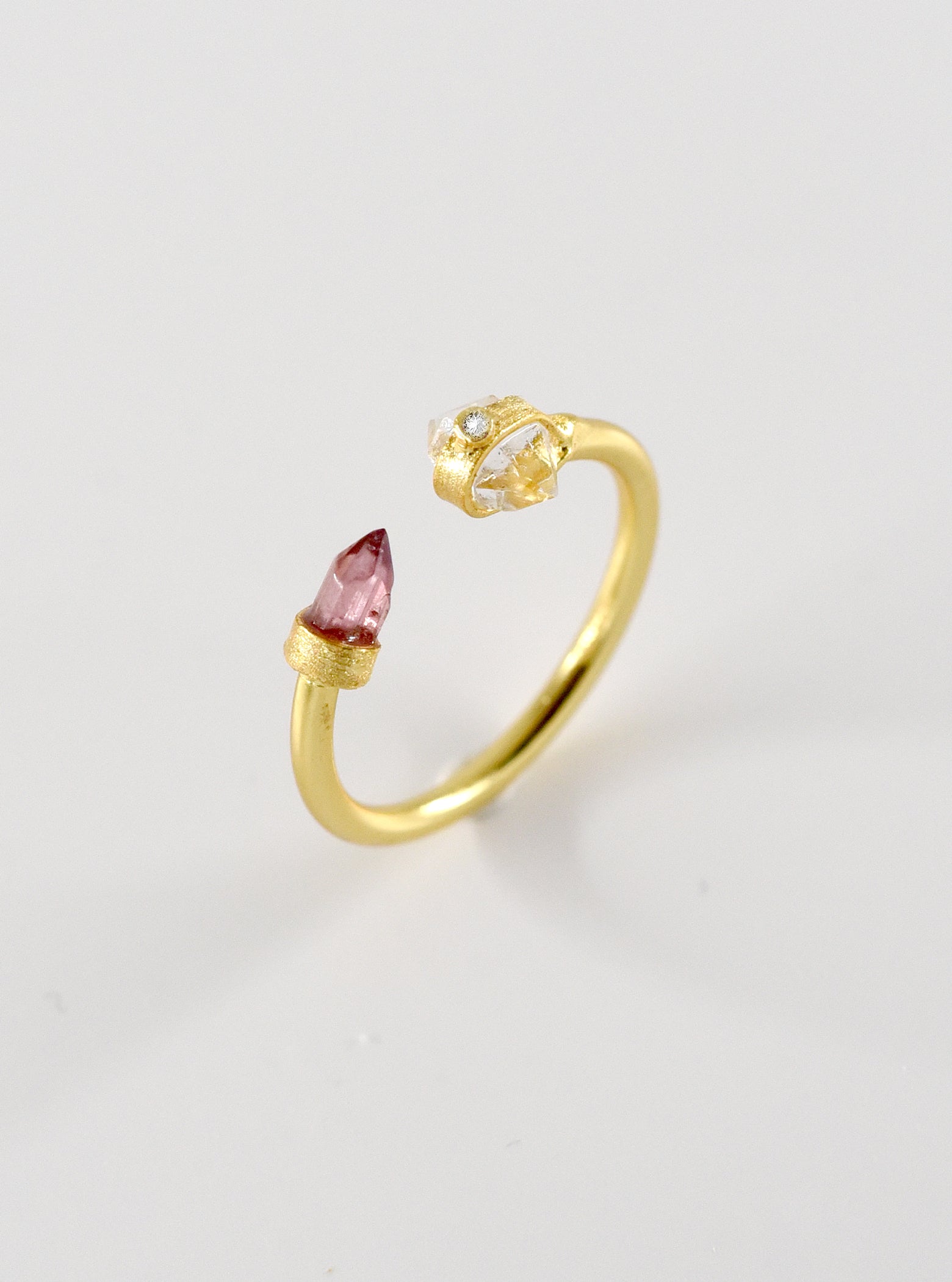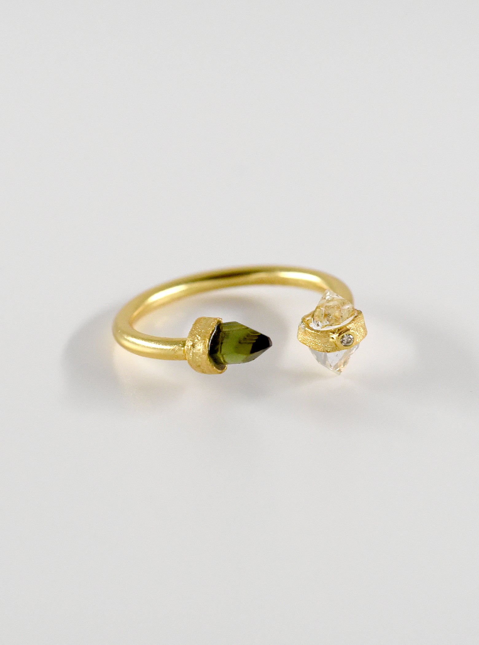 Ring featuring two one of a kind natural tourmaline and herkimer dimond in hand crafted settings.
