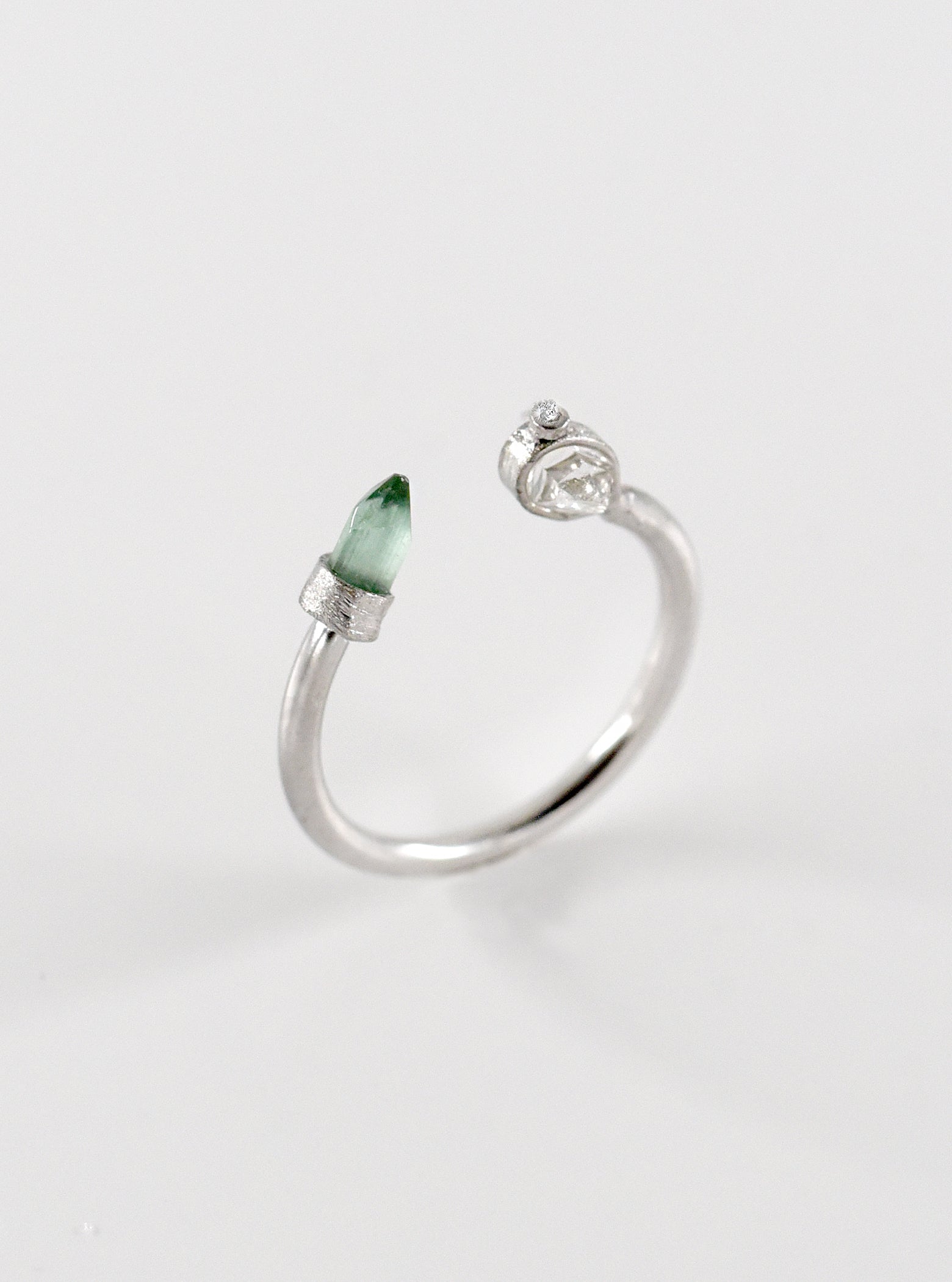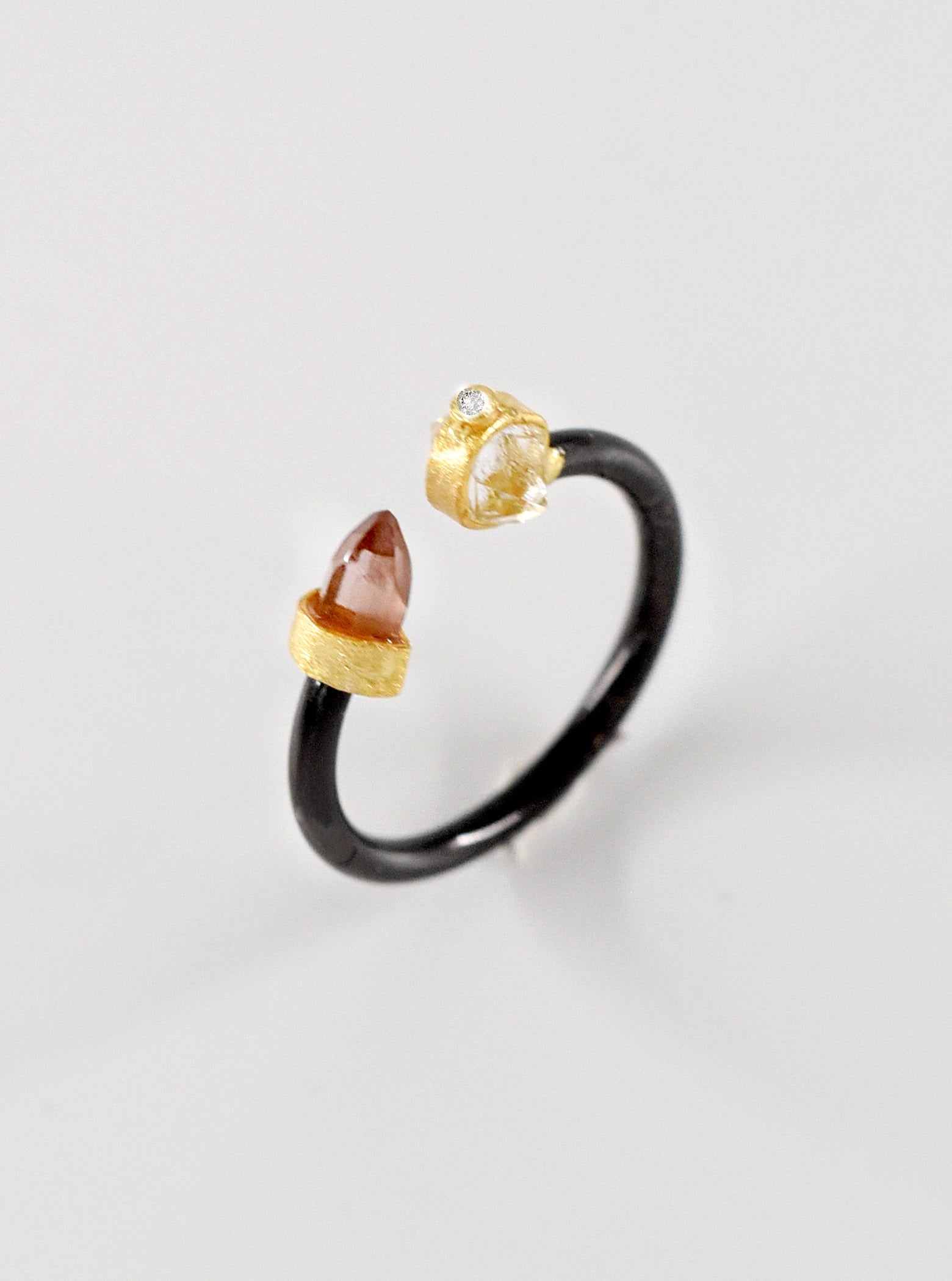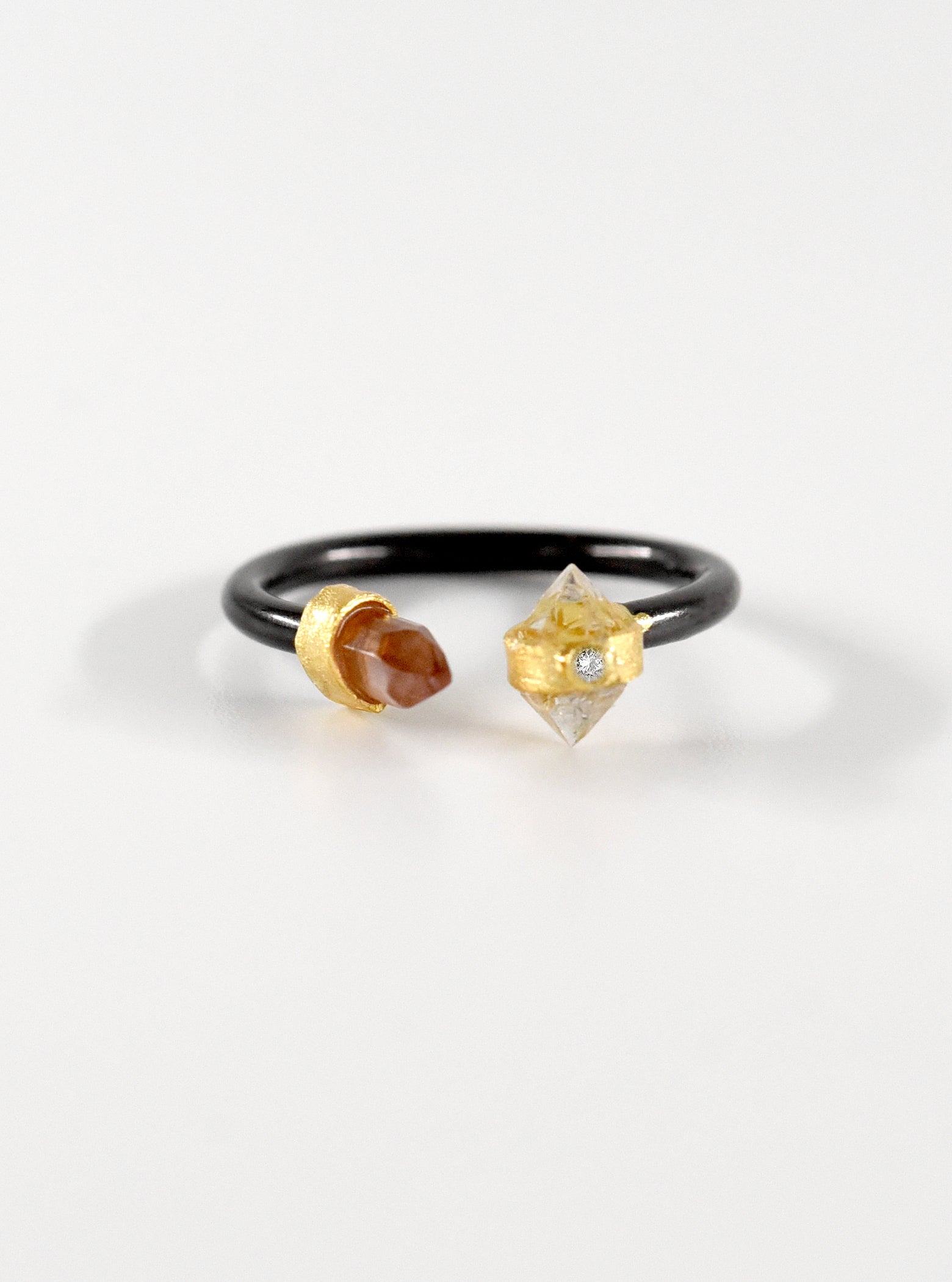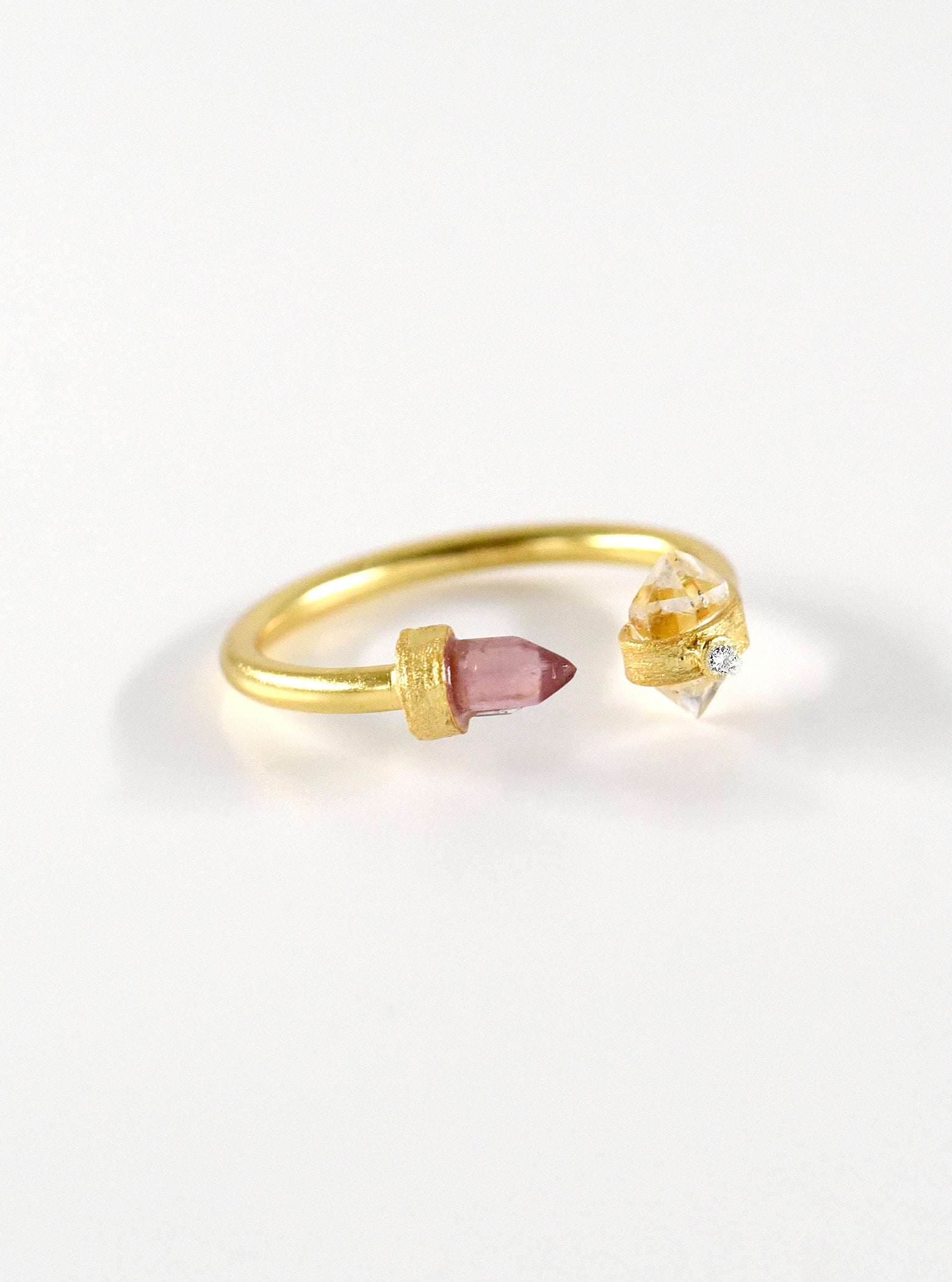Ring featuring two one of a kind natural tourmaline and herkimer dimond in hand crafted settings.