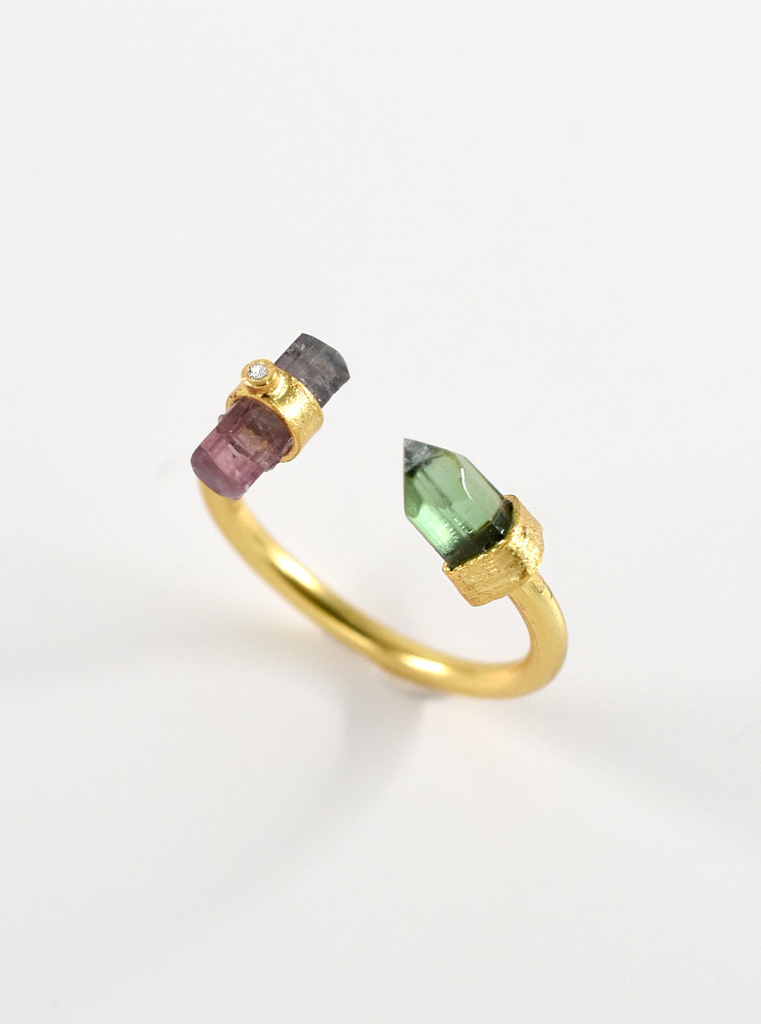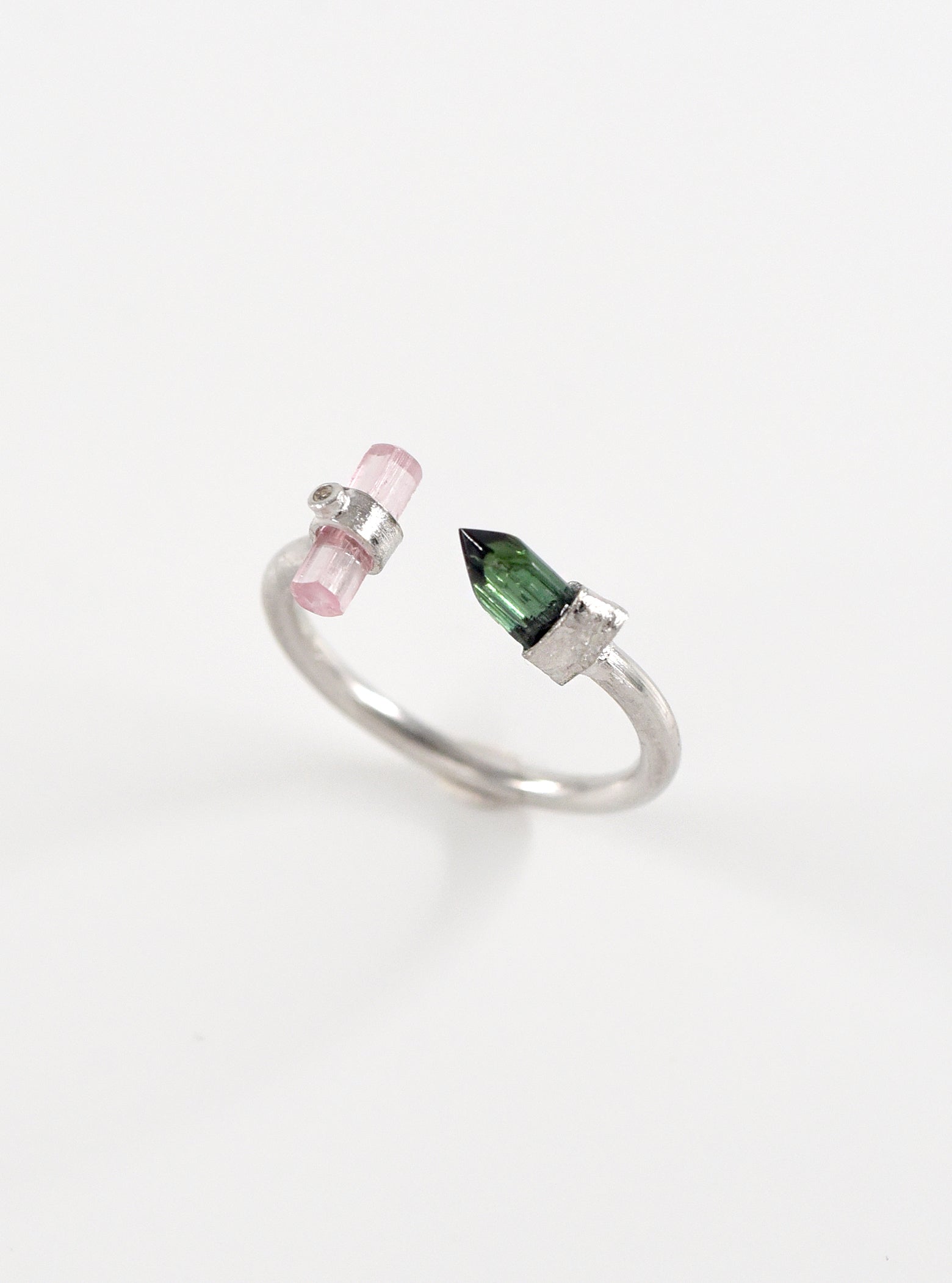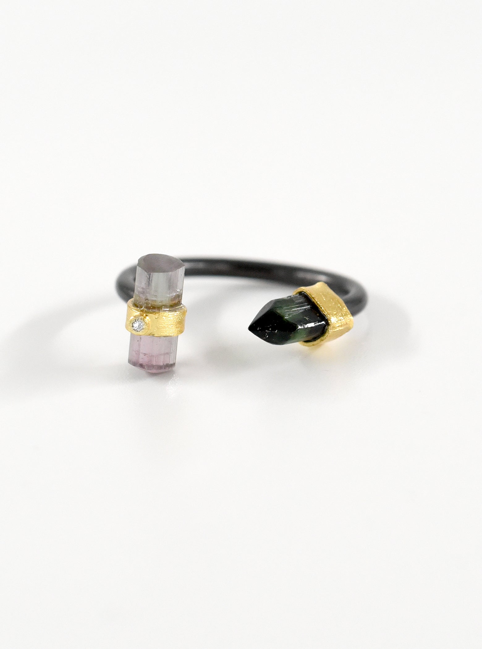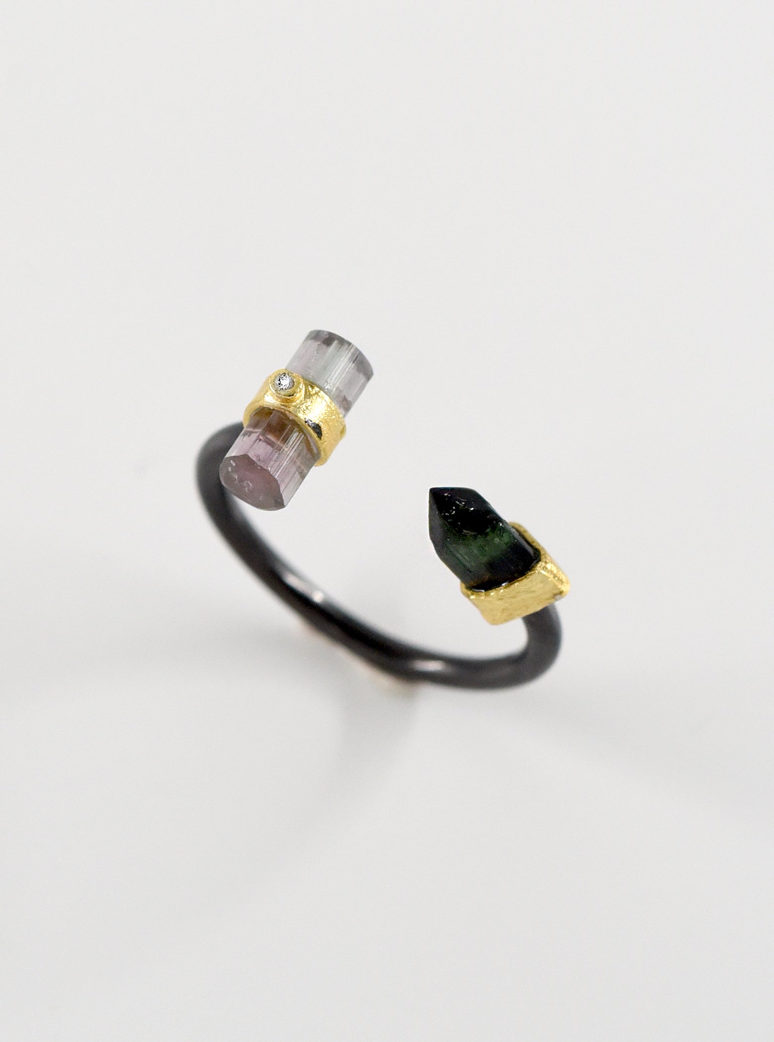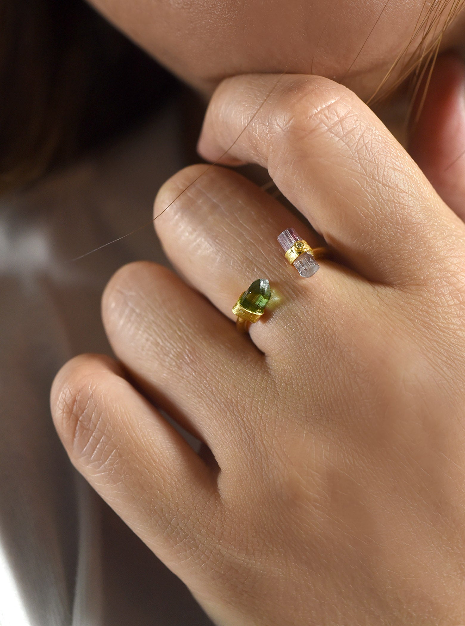 Ring featuring two one of a kind natural tourmaline in hand crafted settings.