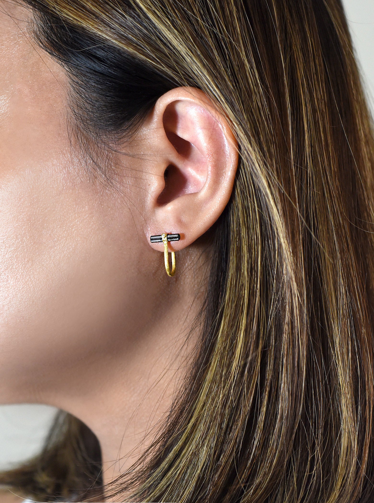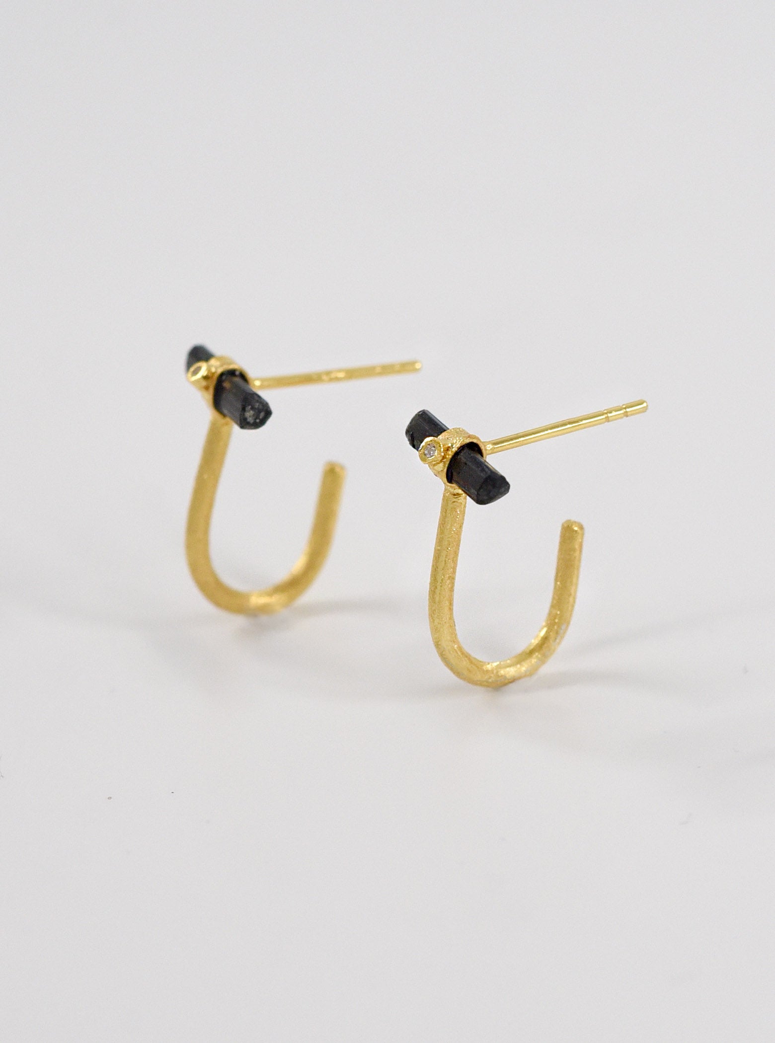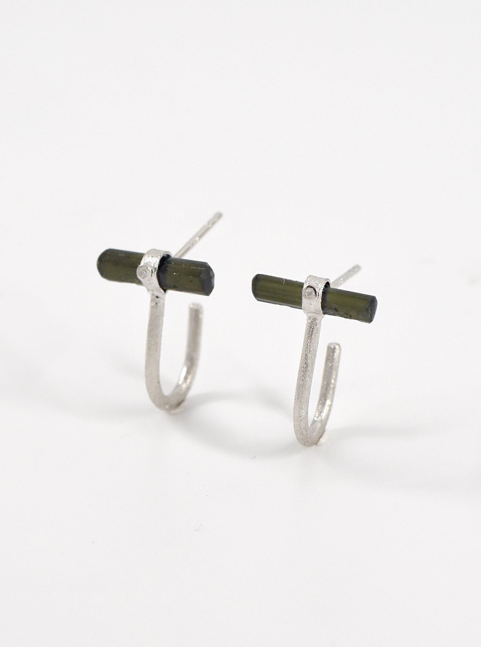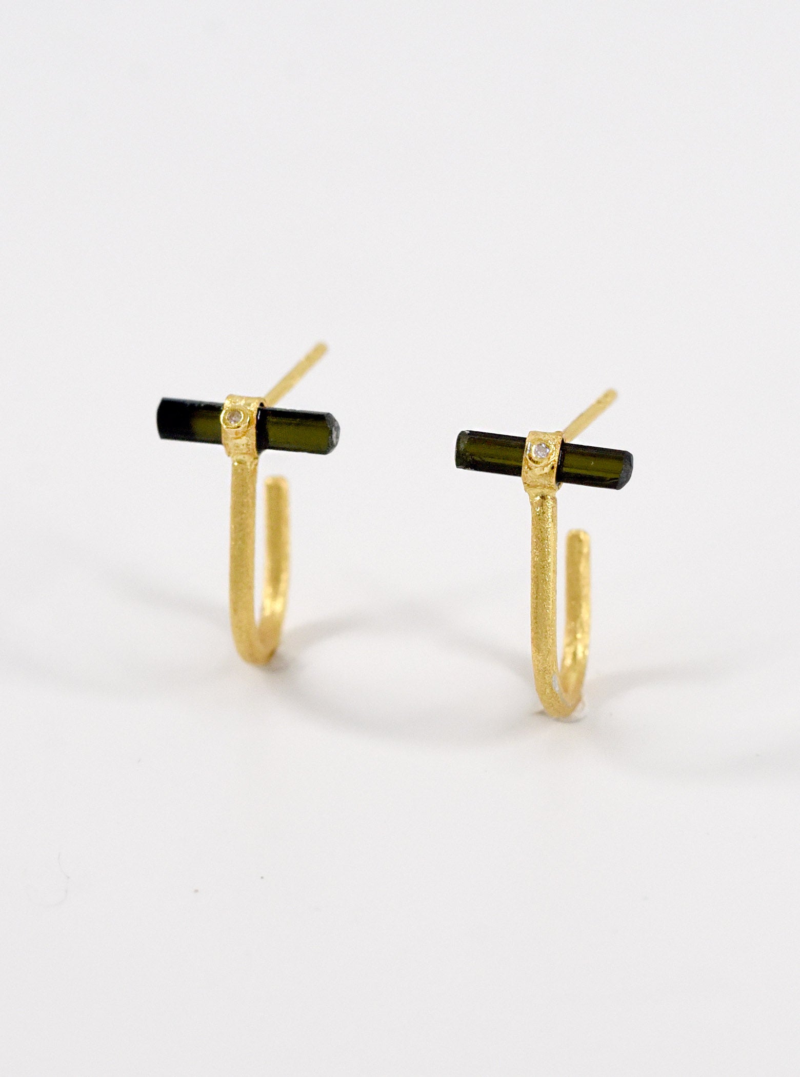 Featuring a one of a kind natural tourmaline with diamond hoop in a hand crafted setting, sparkling natural diamond accents and brushed finished with stud back closures.