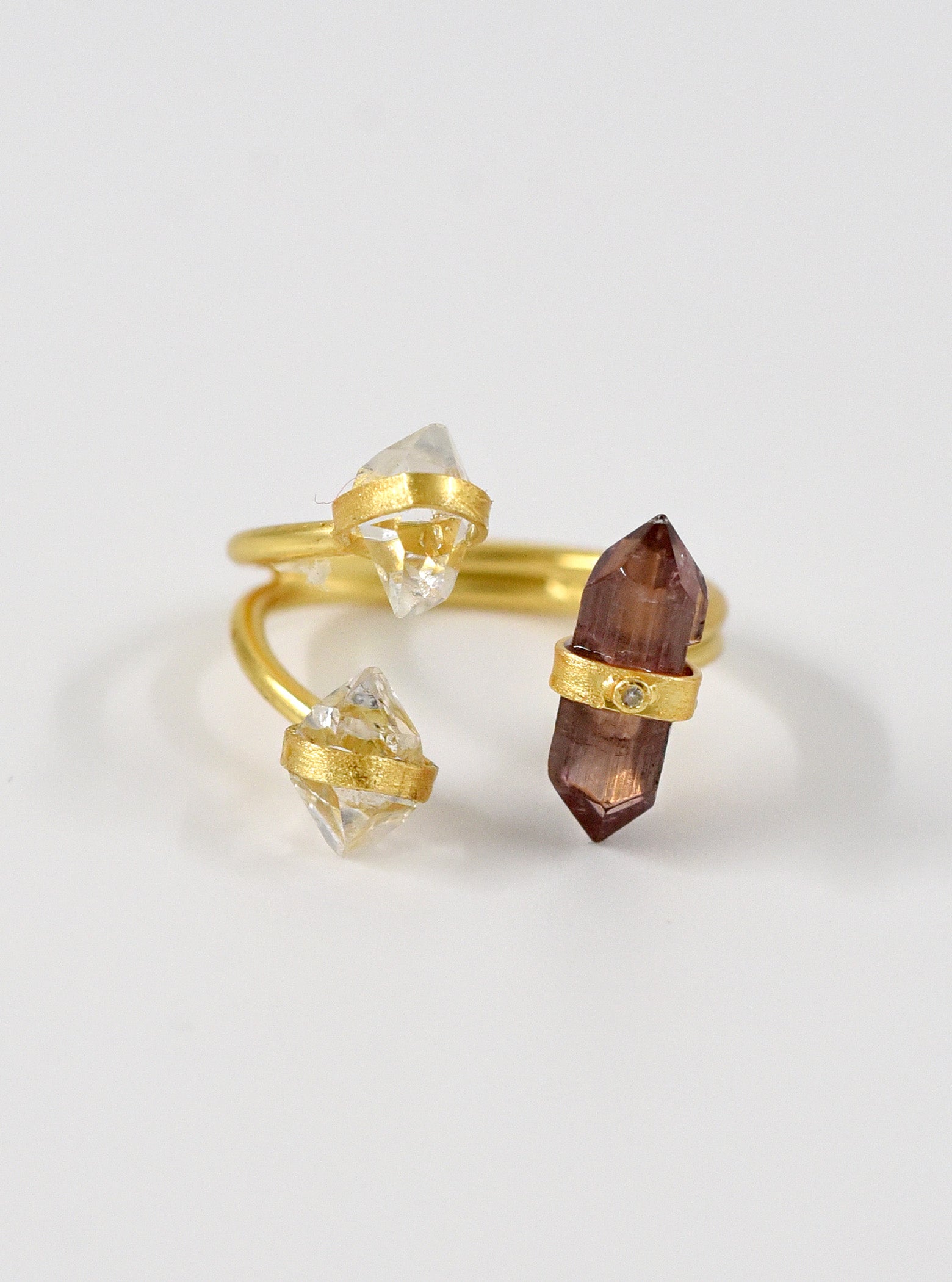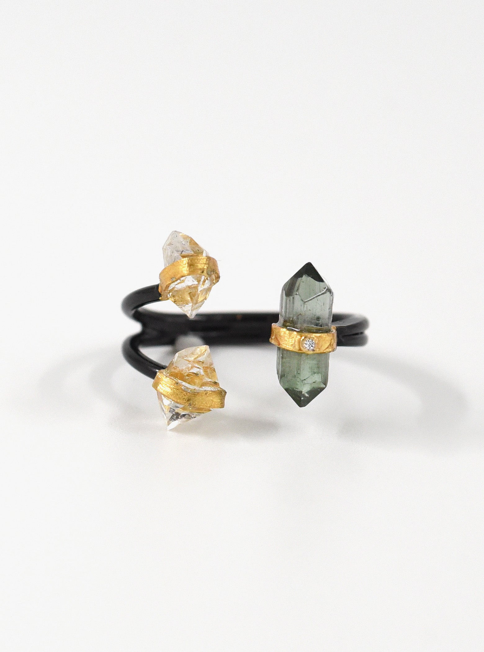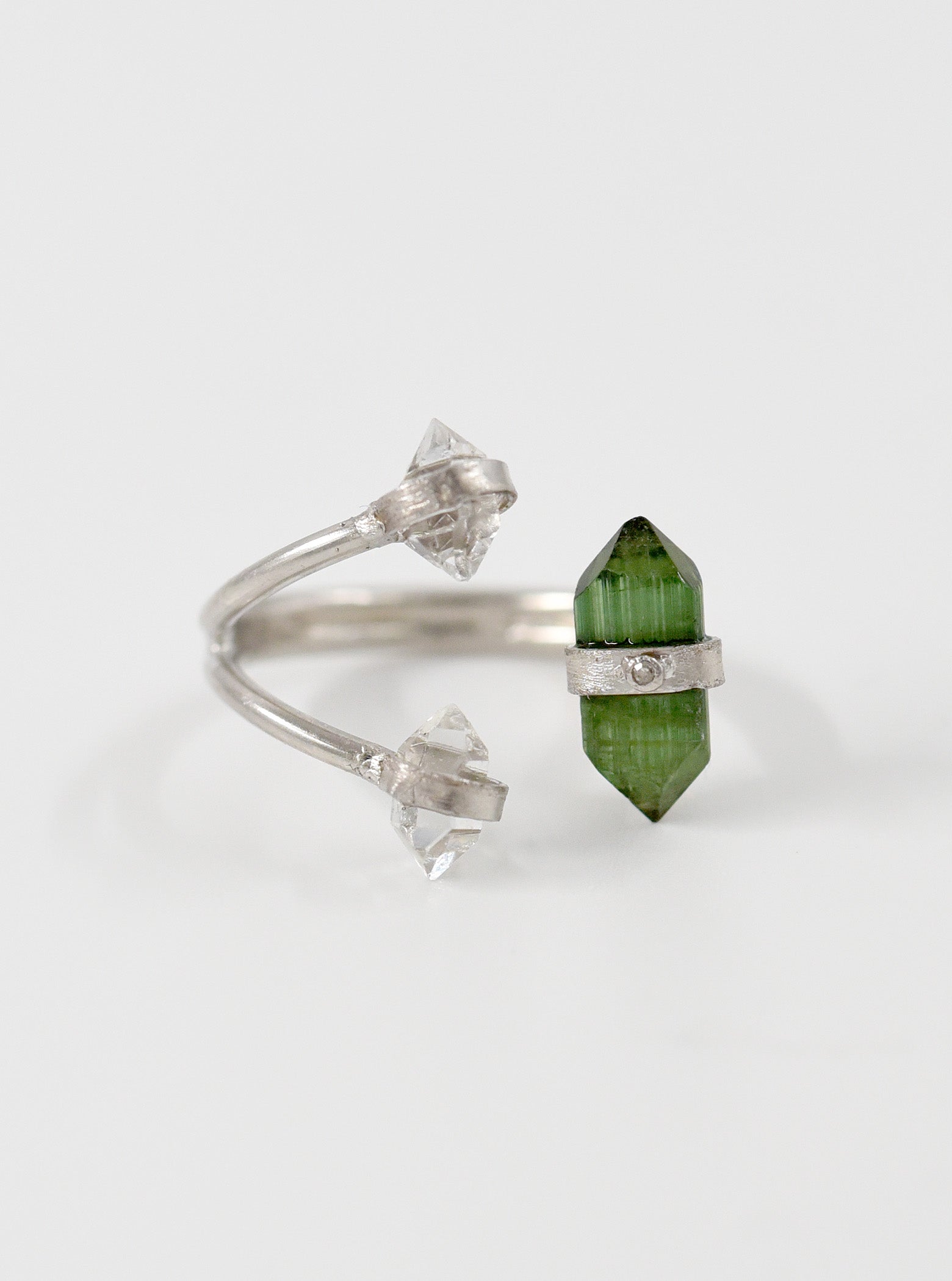 Triple Quartz Herkimer with Tourmaline Diamond Open Ring