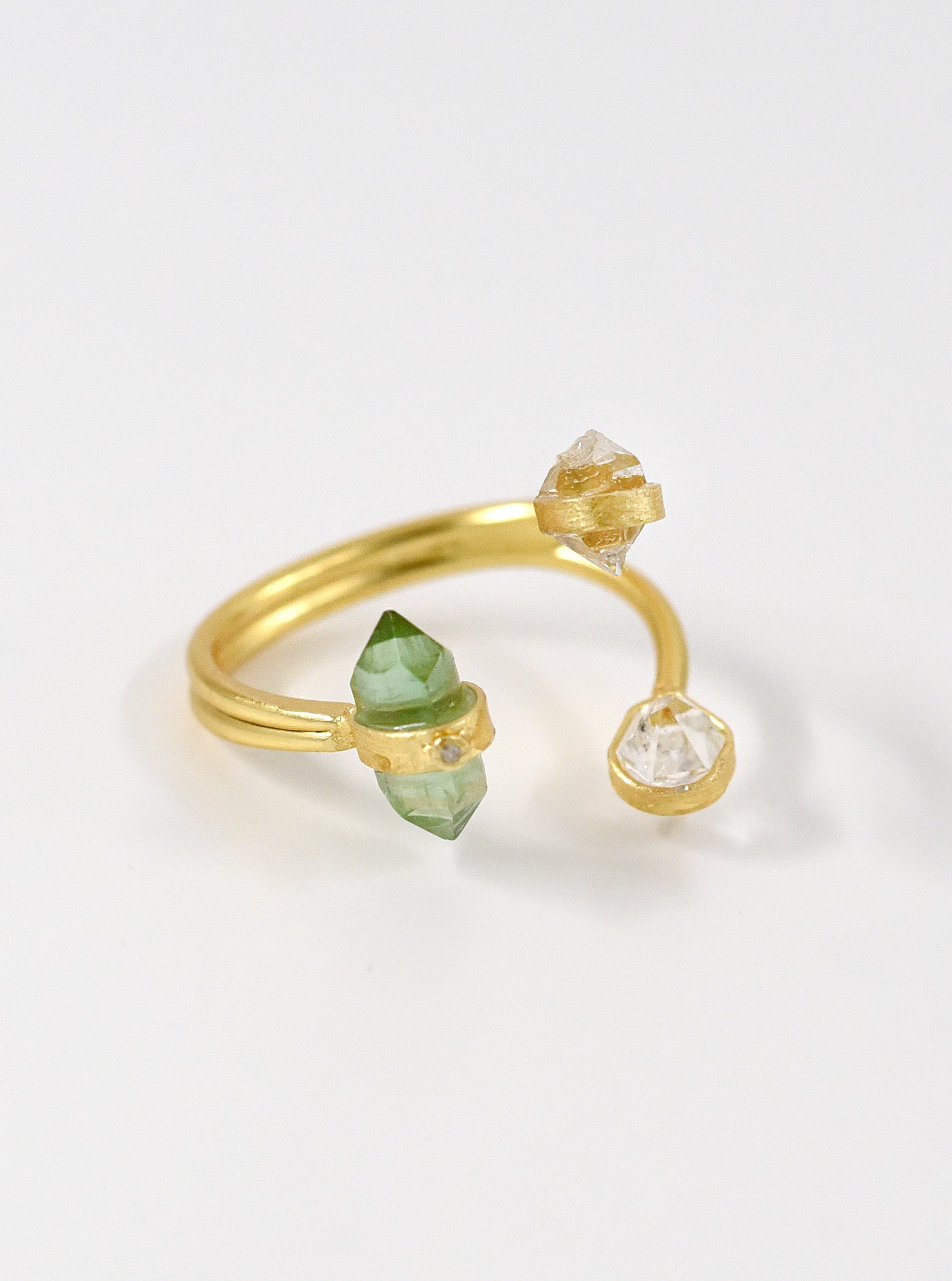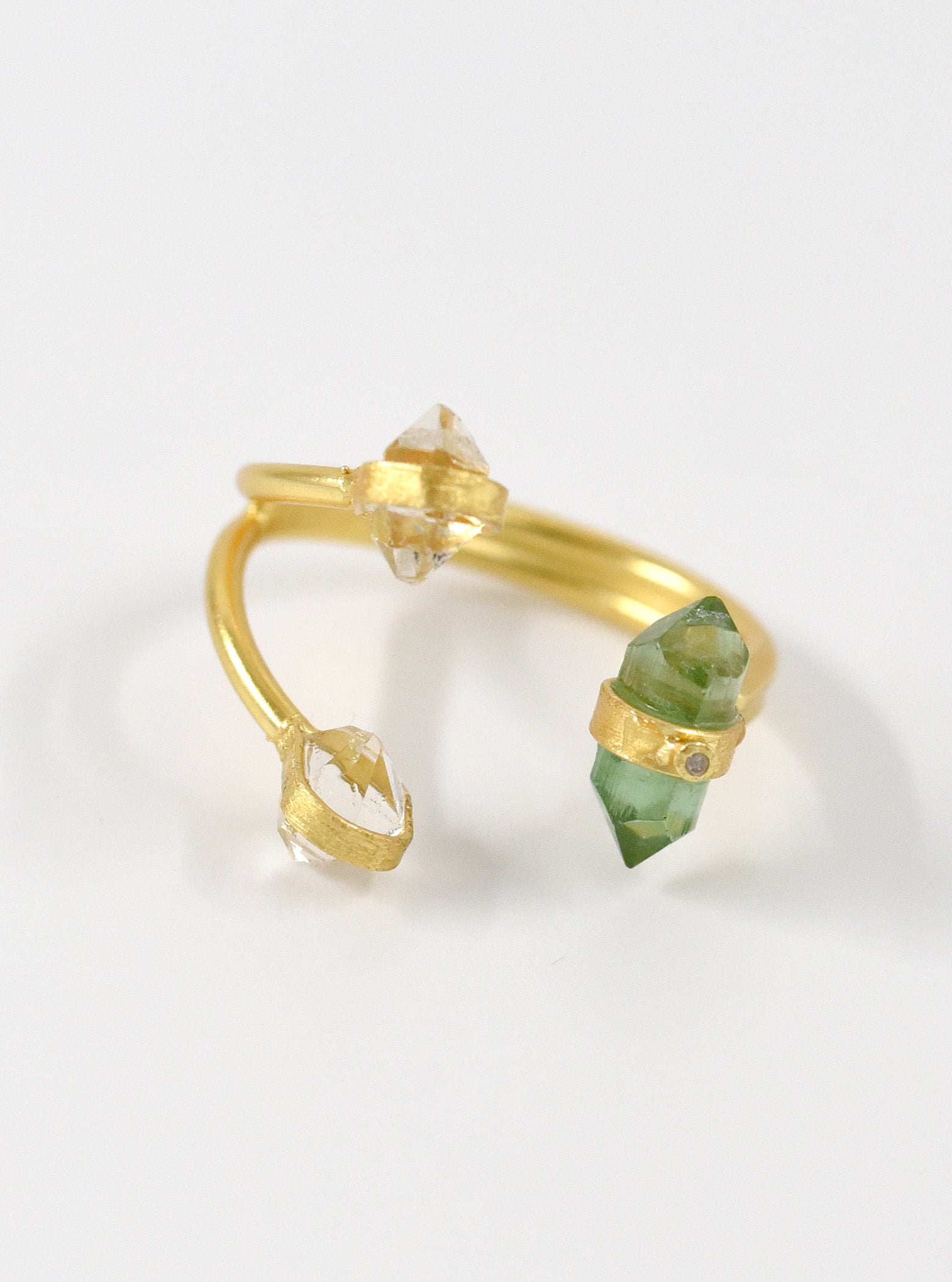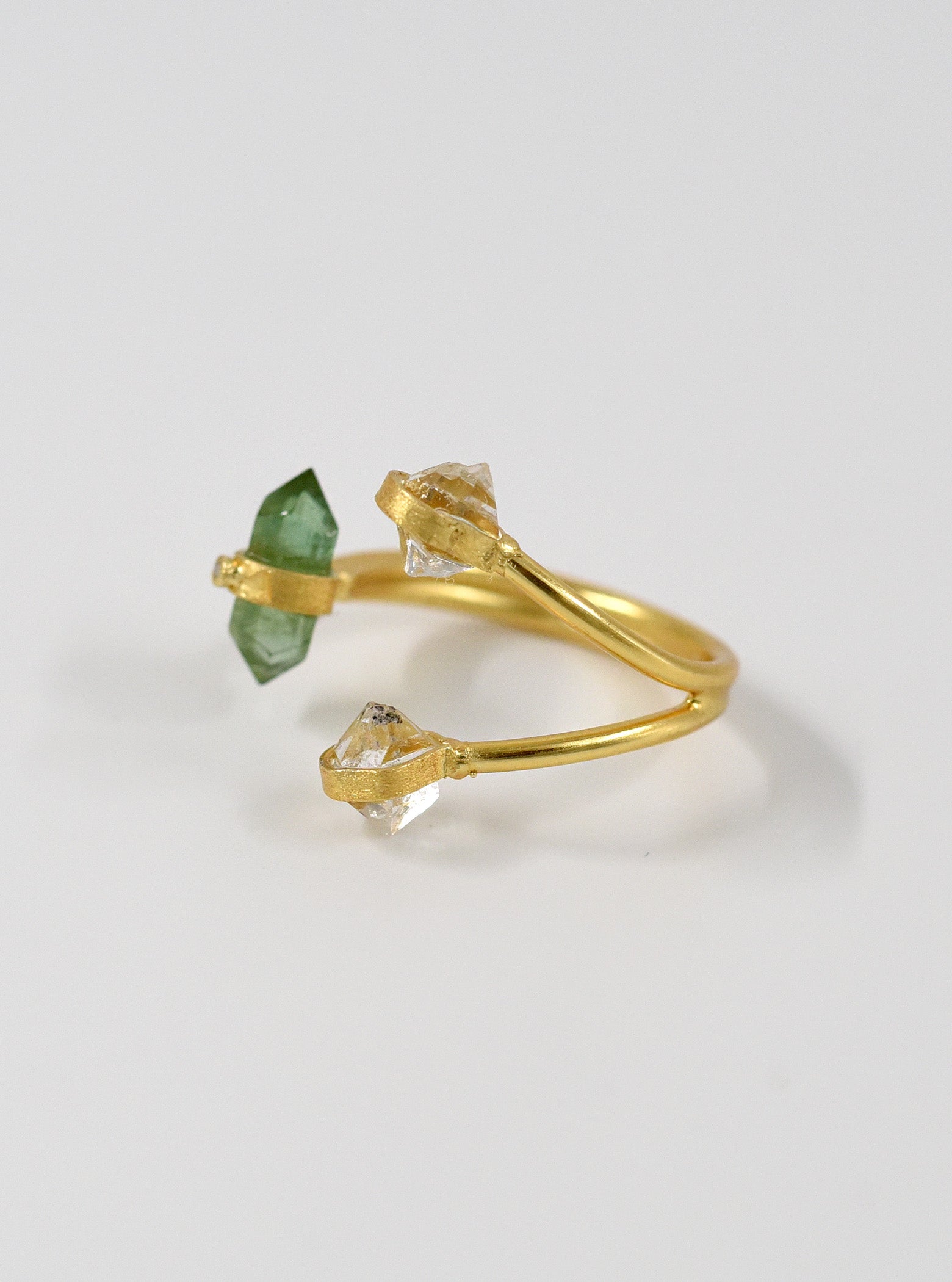 Triple Quartz Herkimer with Tourmaline Diamond Open Ring